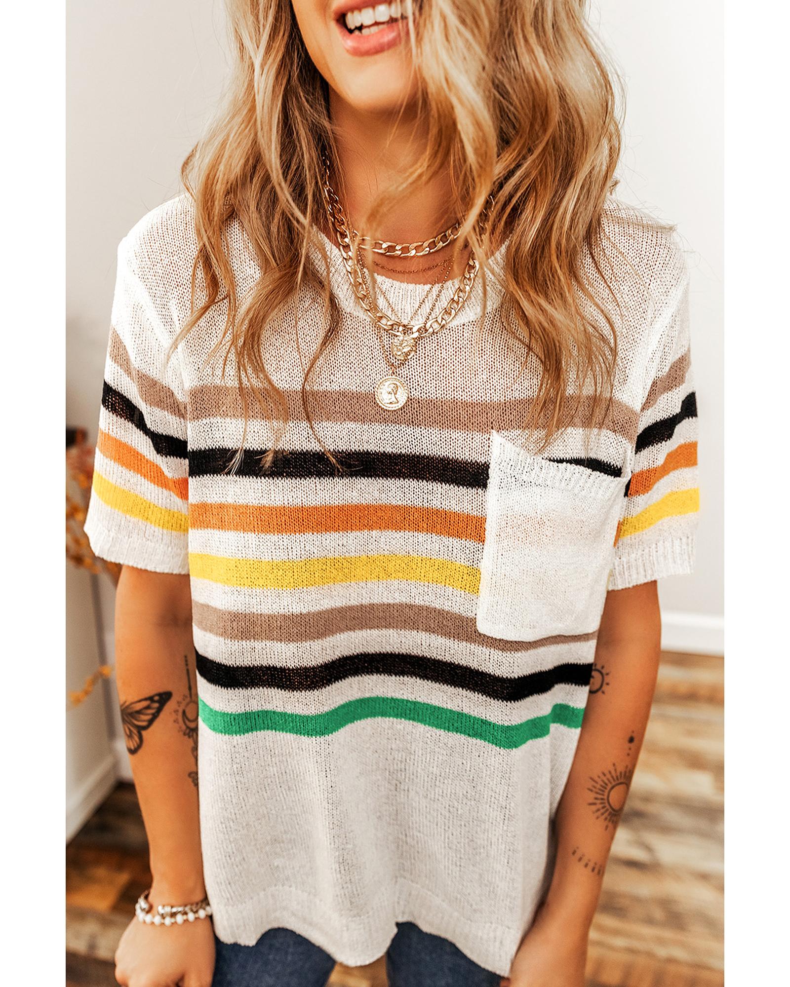 - White Striped Pocketed Loose Fit Crewneck Knitted T