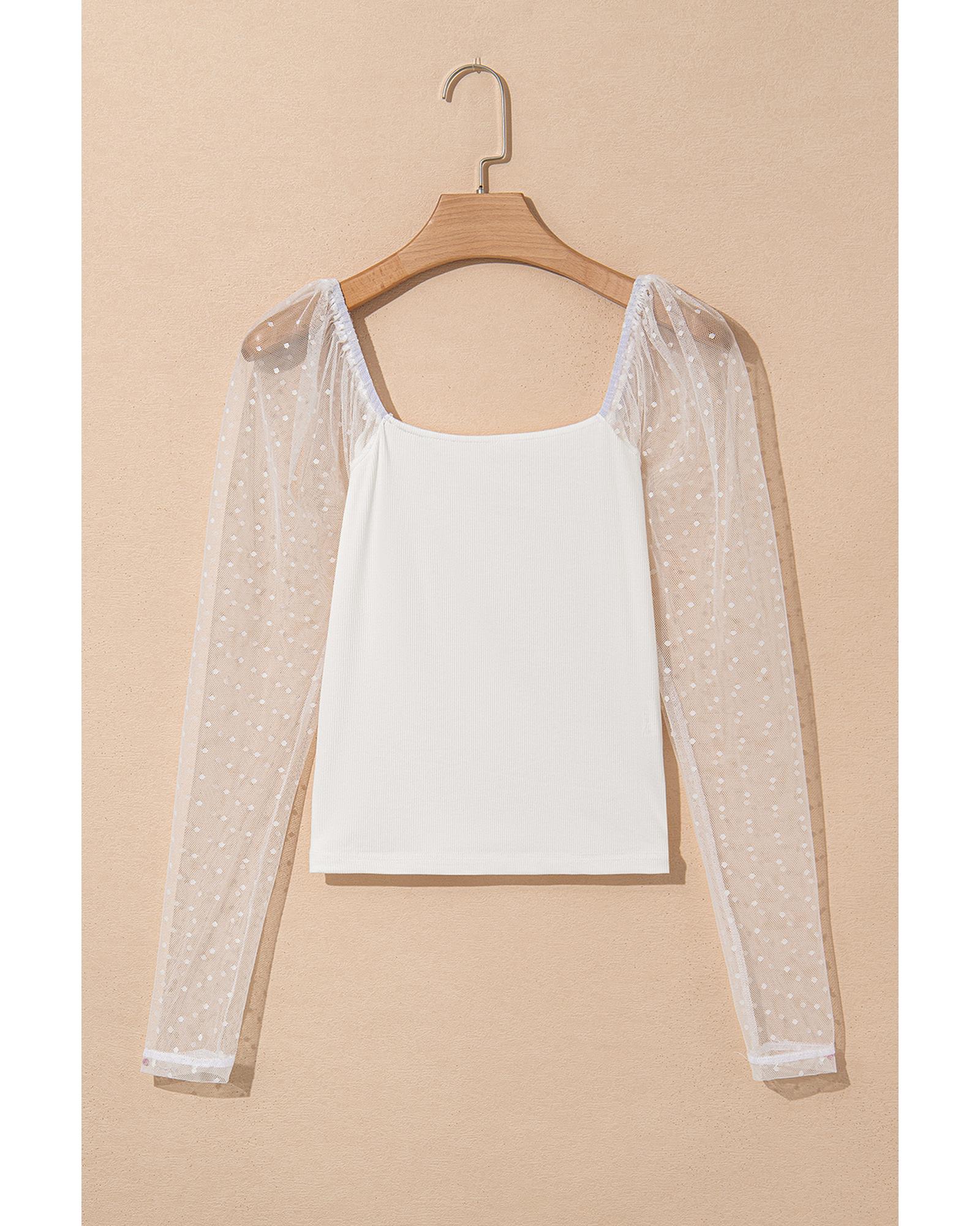 White Swiss Dot Mesh Long Sleeve Square Neck Slim Top – S