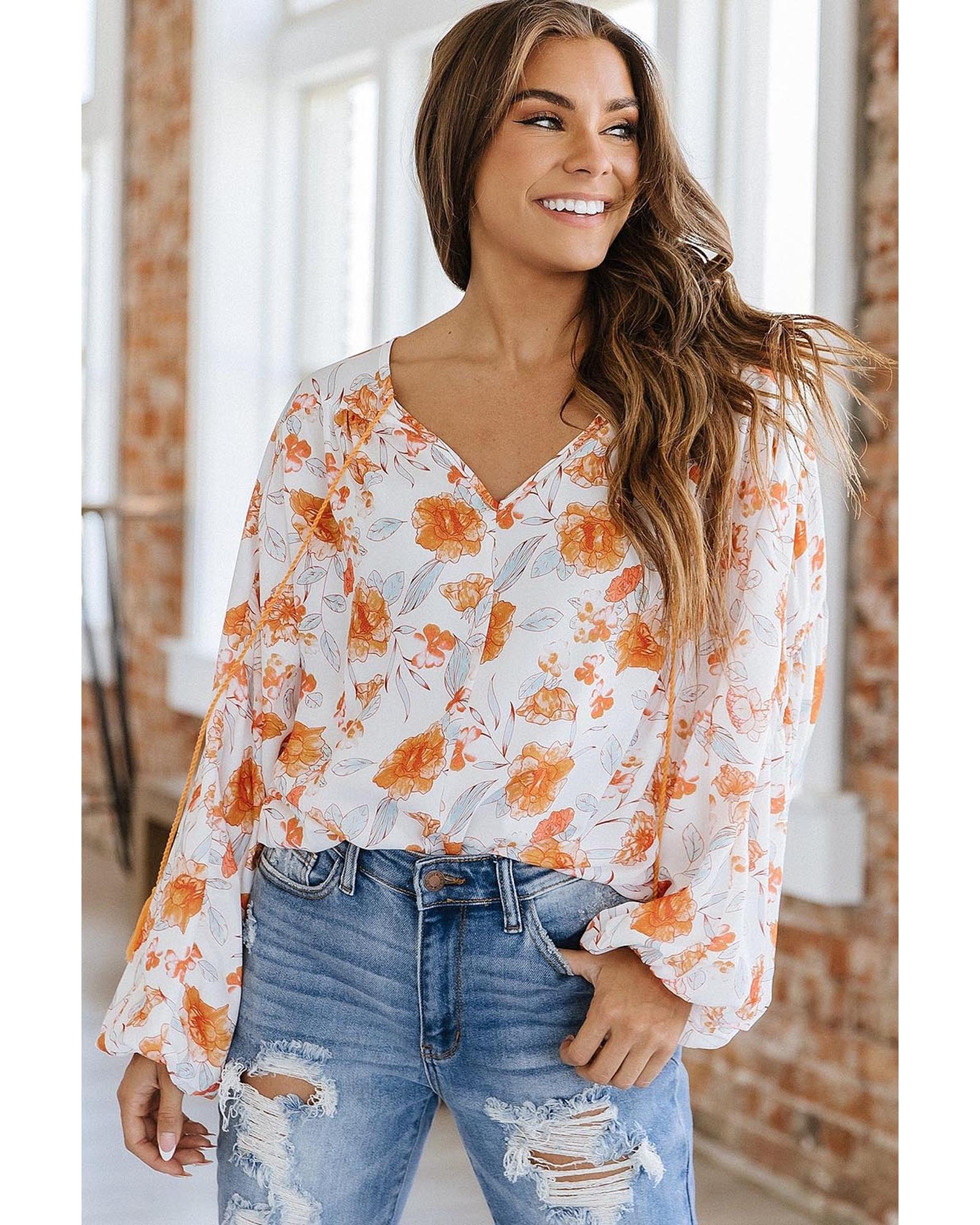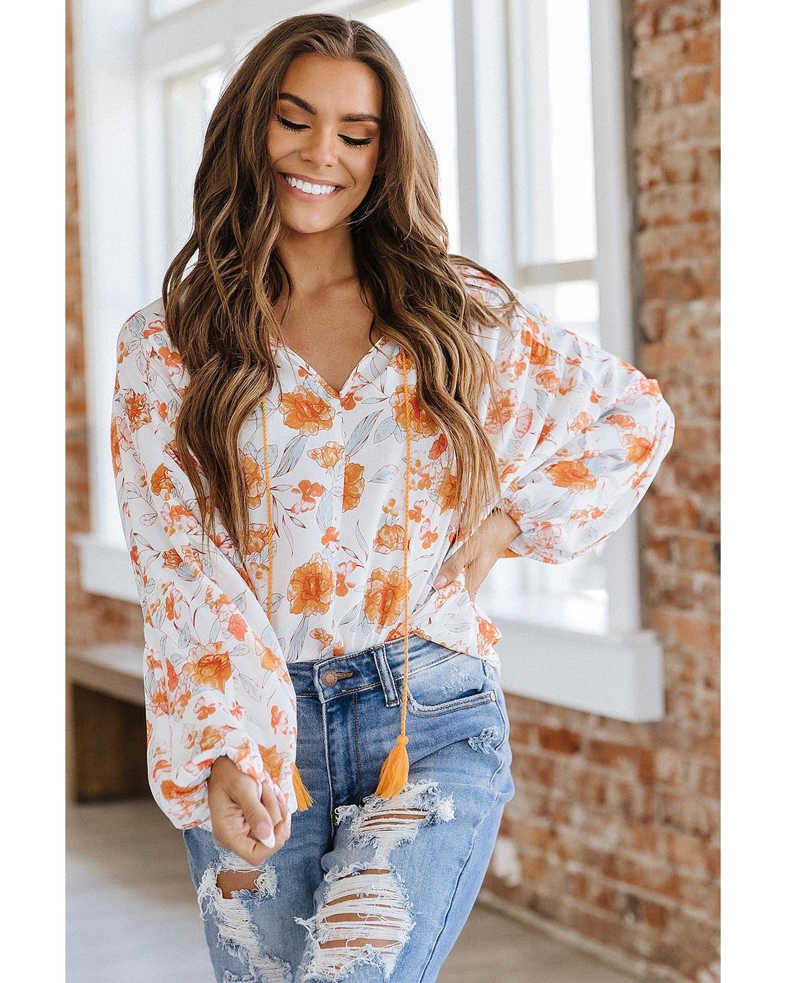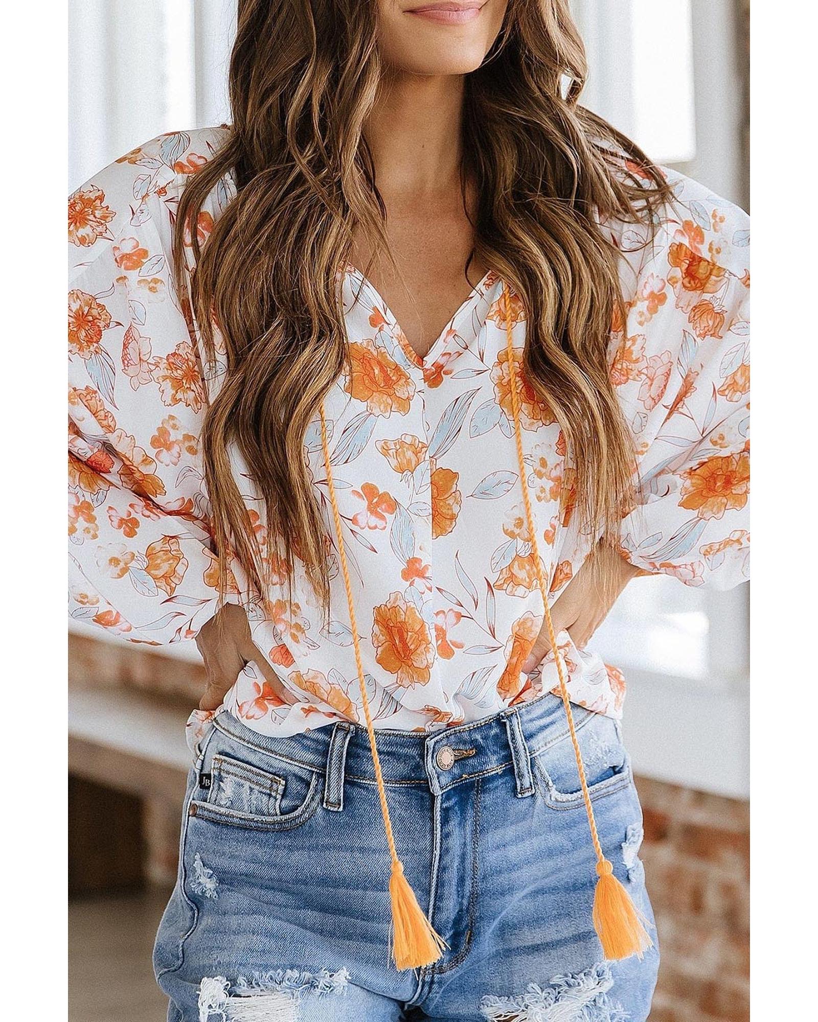 White Tassel Tie V Neck Bubble Sleeve Floral Blouse – M