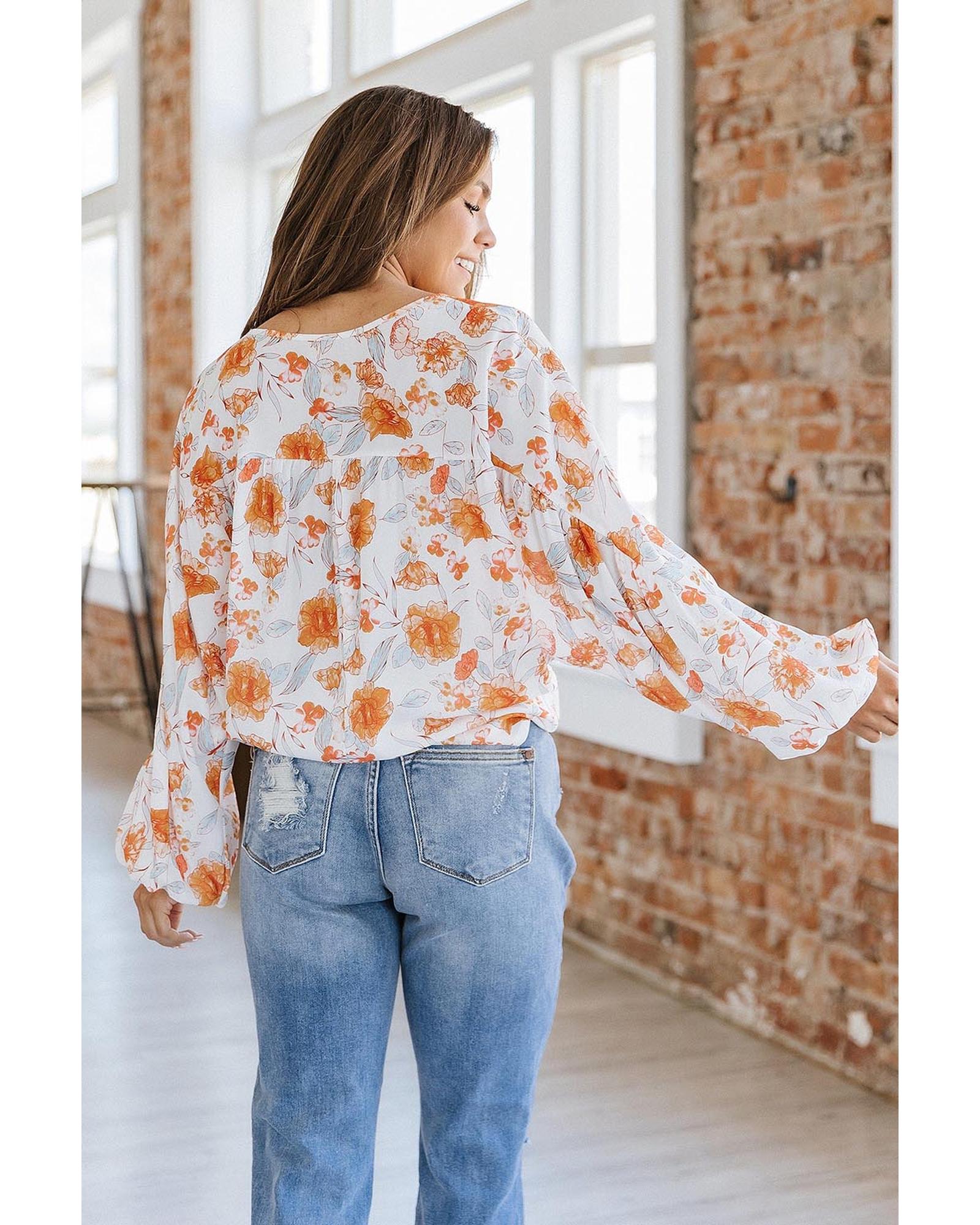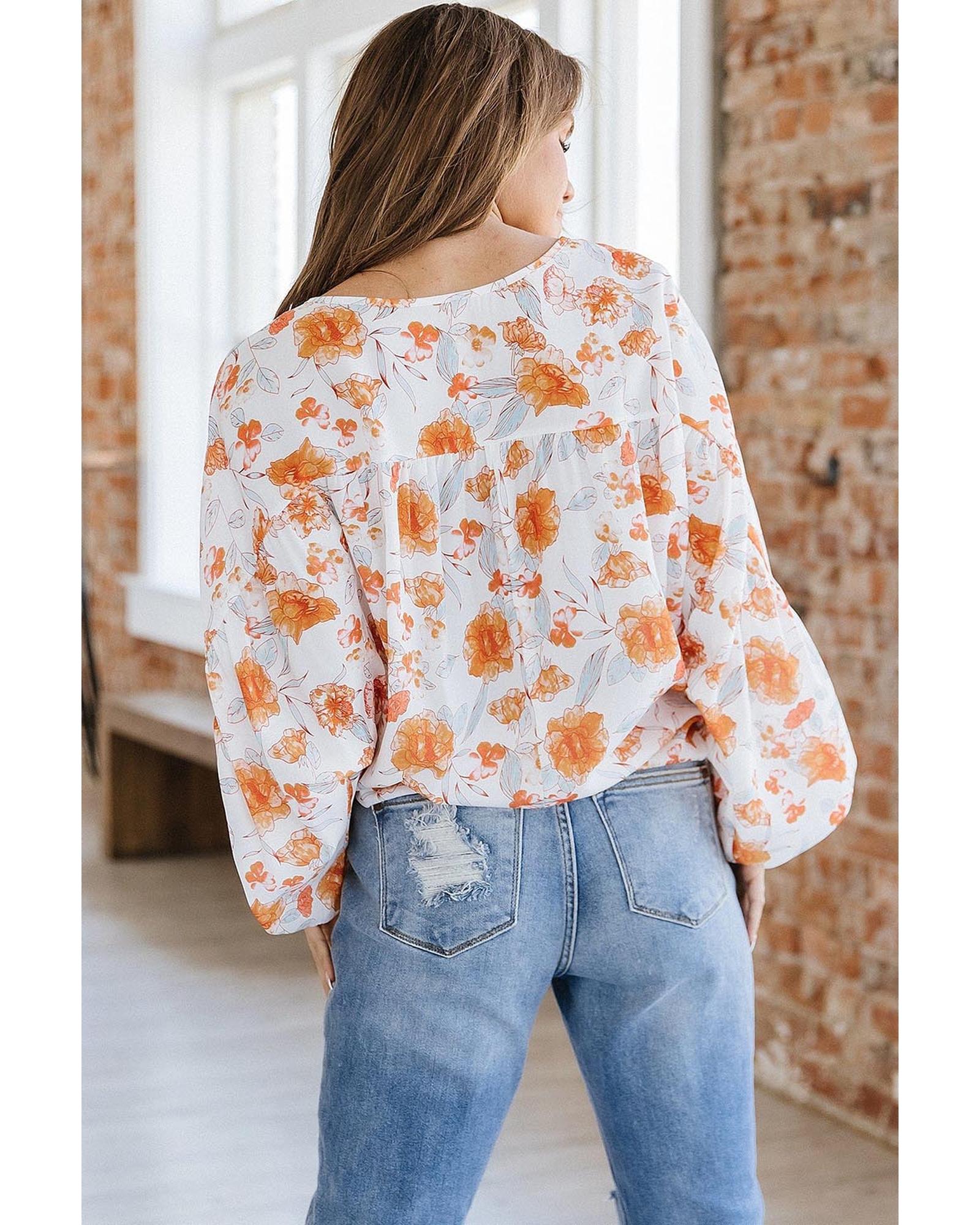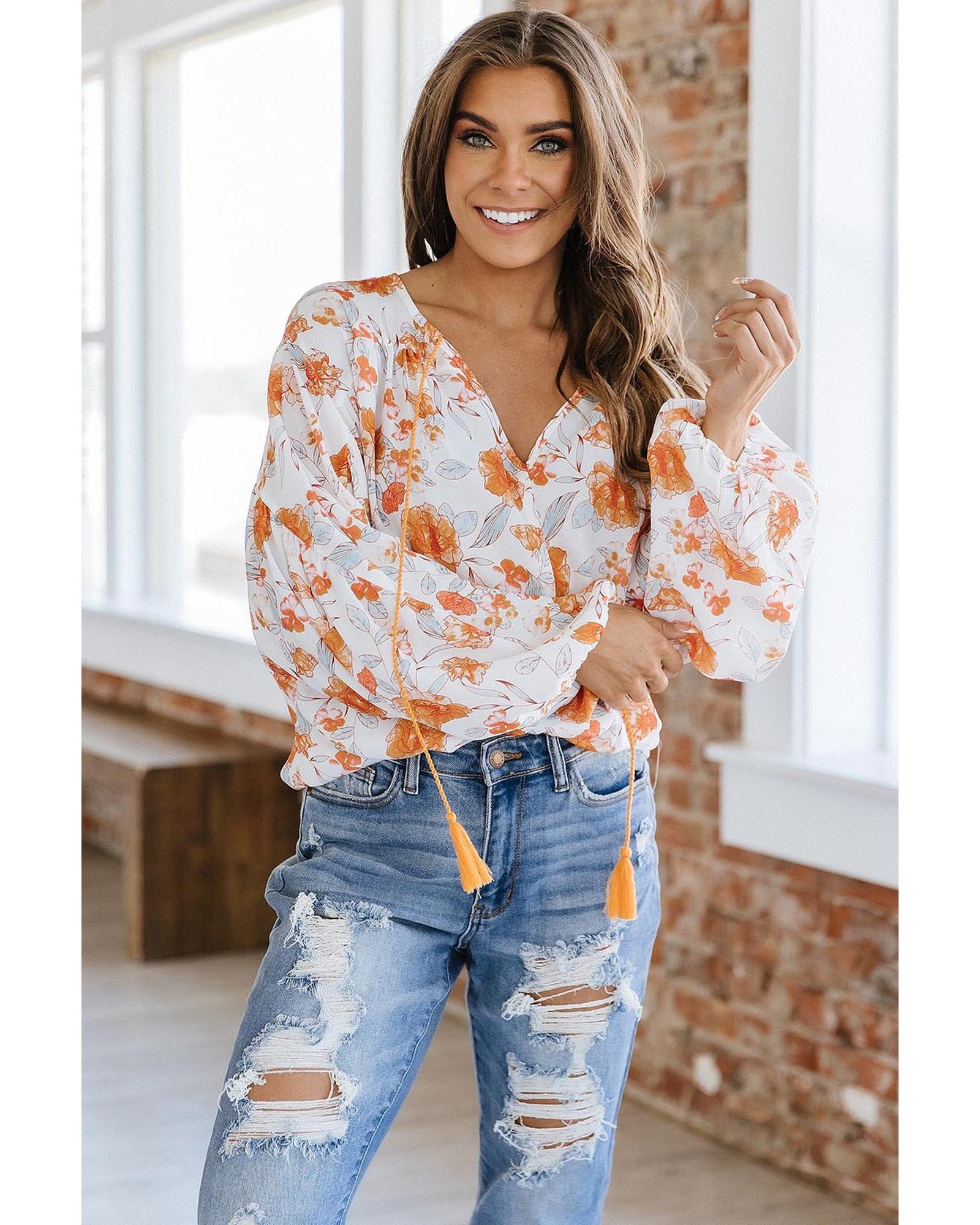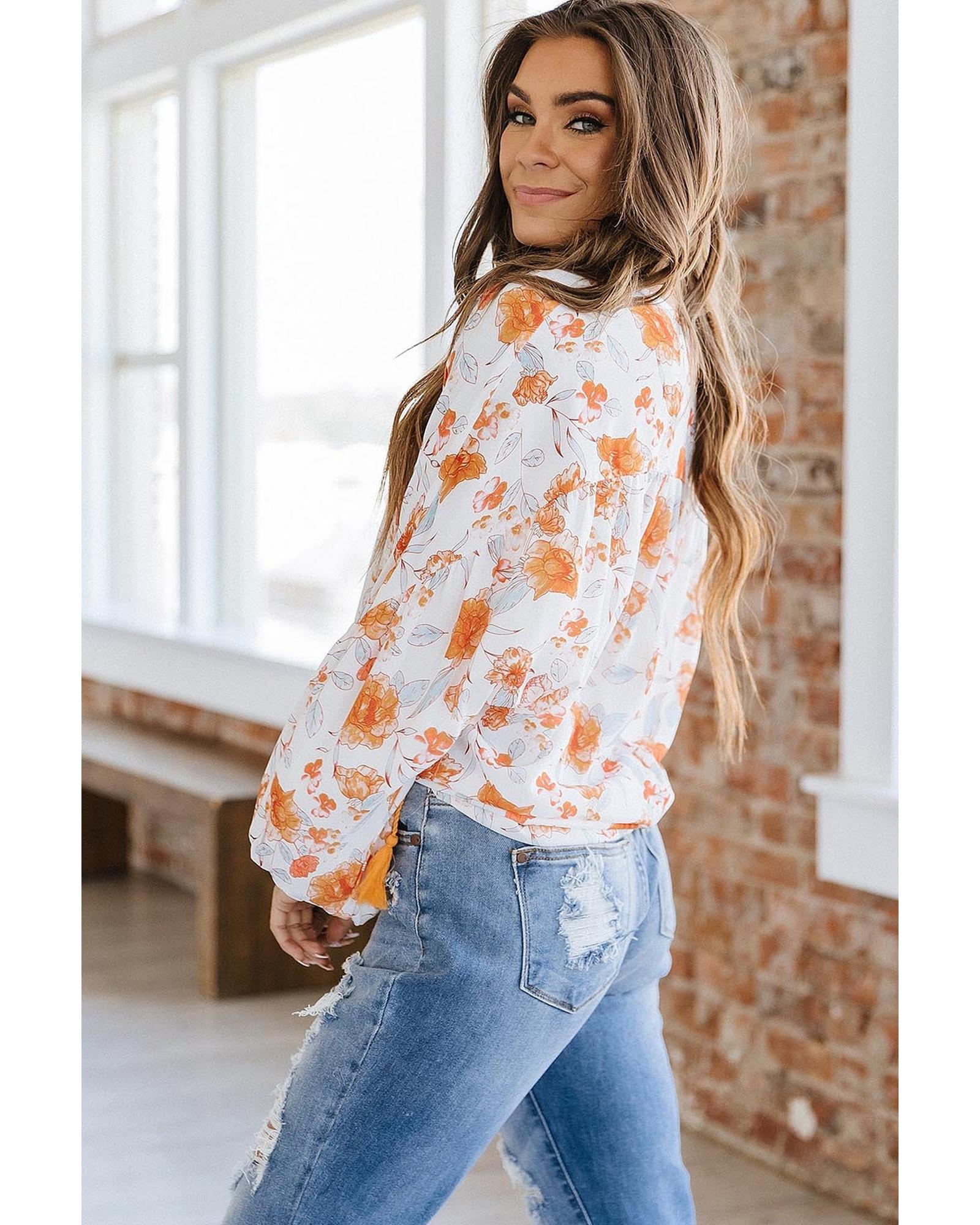 White Tassel Tie V Neck Bubble Sleeve Floral Blouse – M