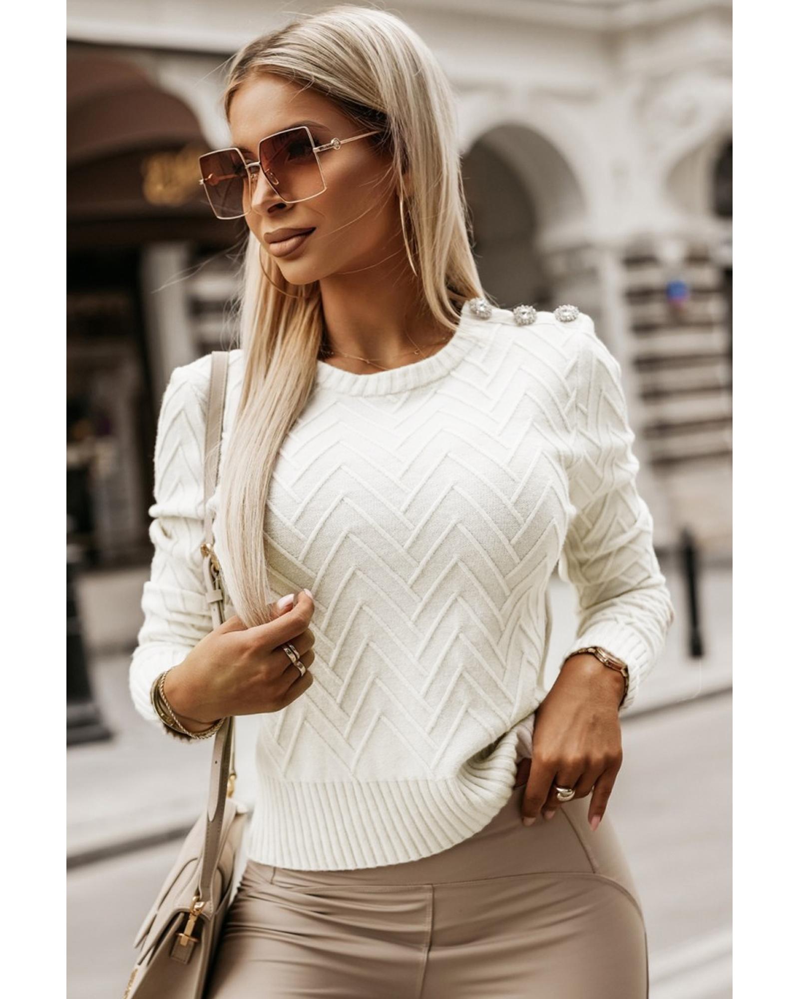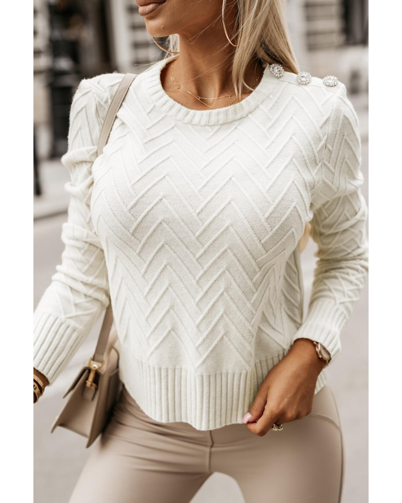 White Textured Knit Button Decor Pullover Sweater – M
