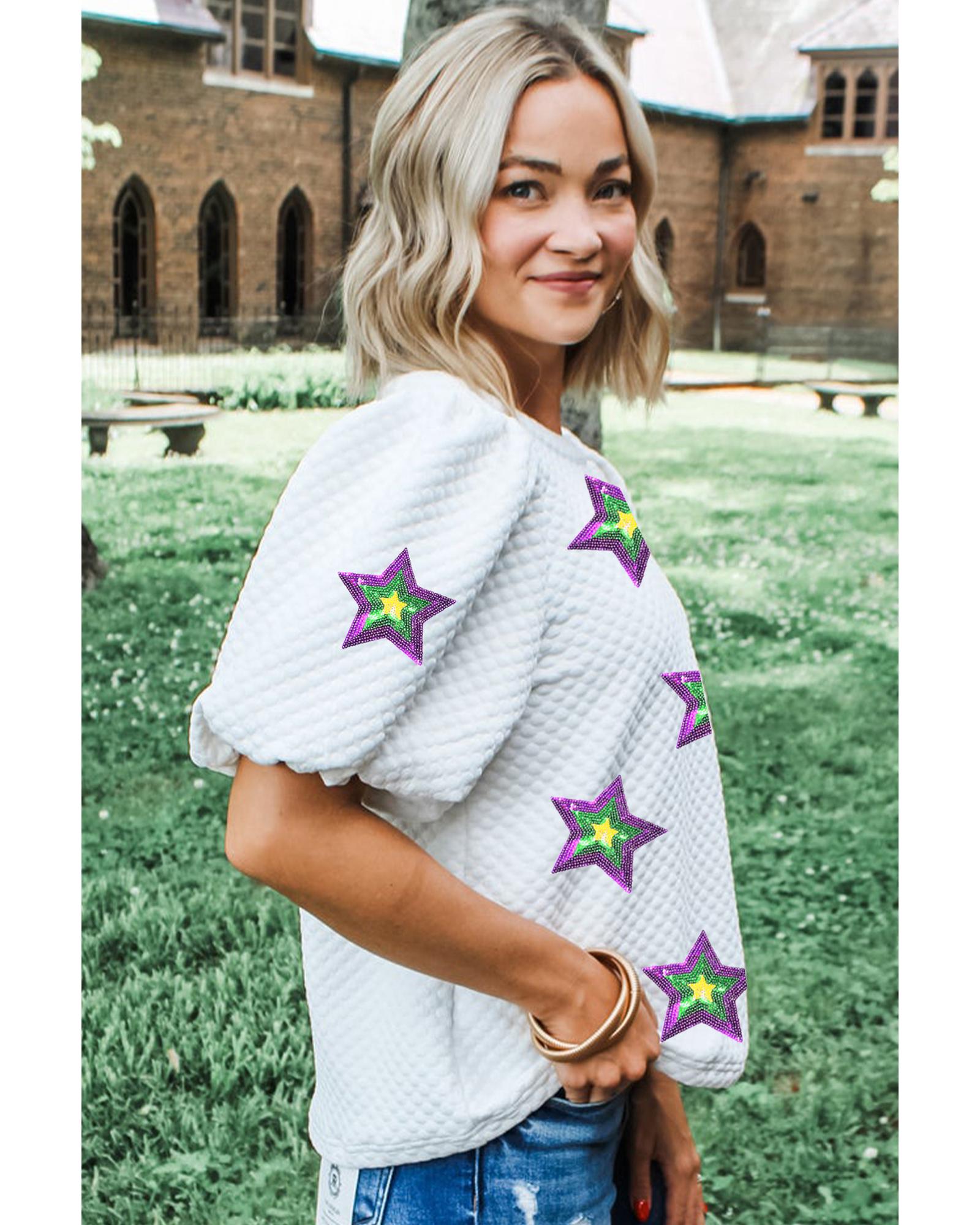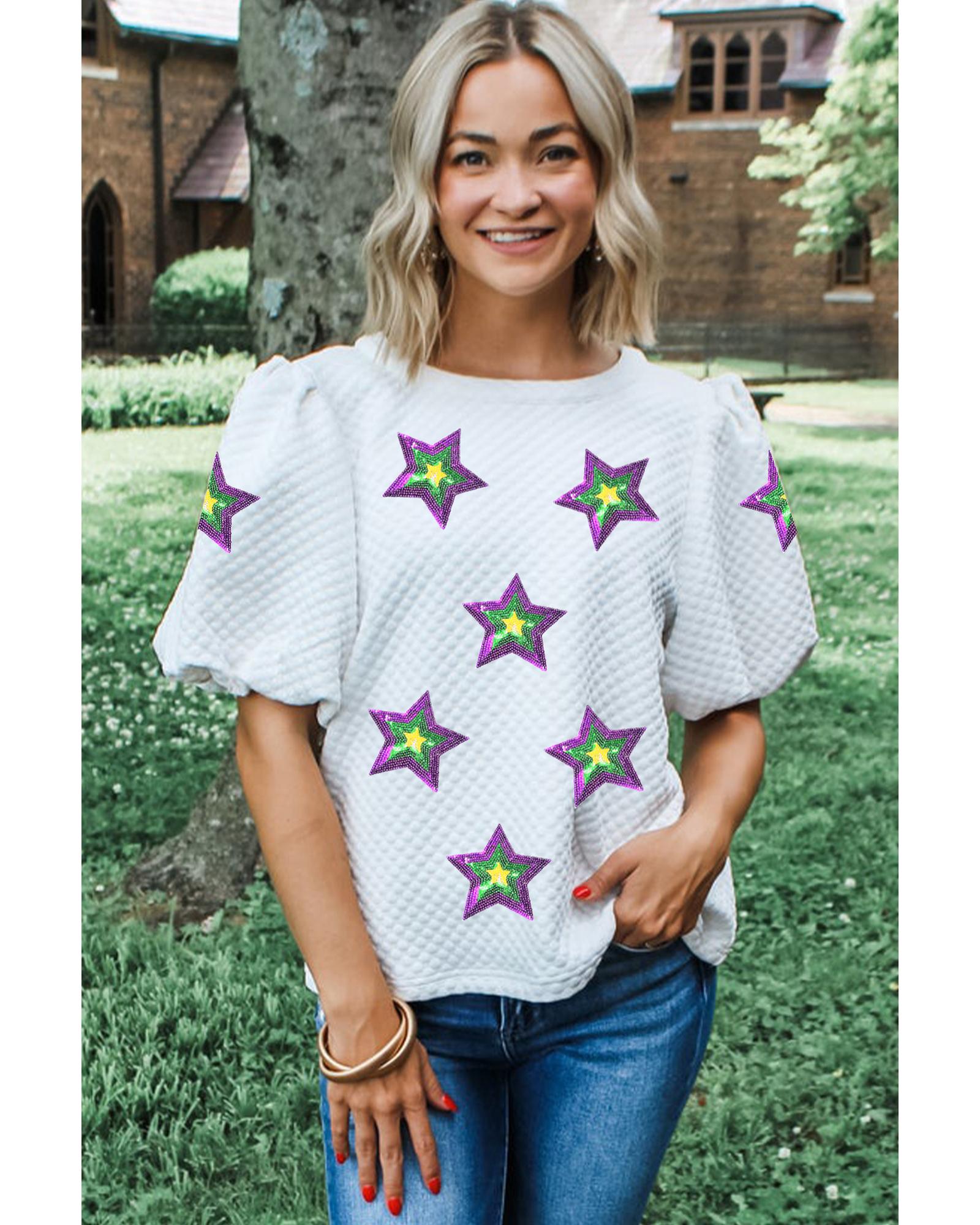 - White Textured Sequin Mardi Gras Star Graphic Puff Sleeve Blouse