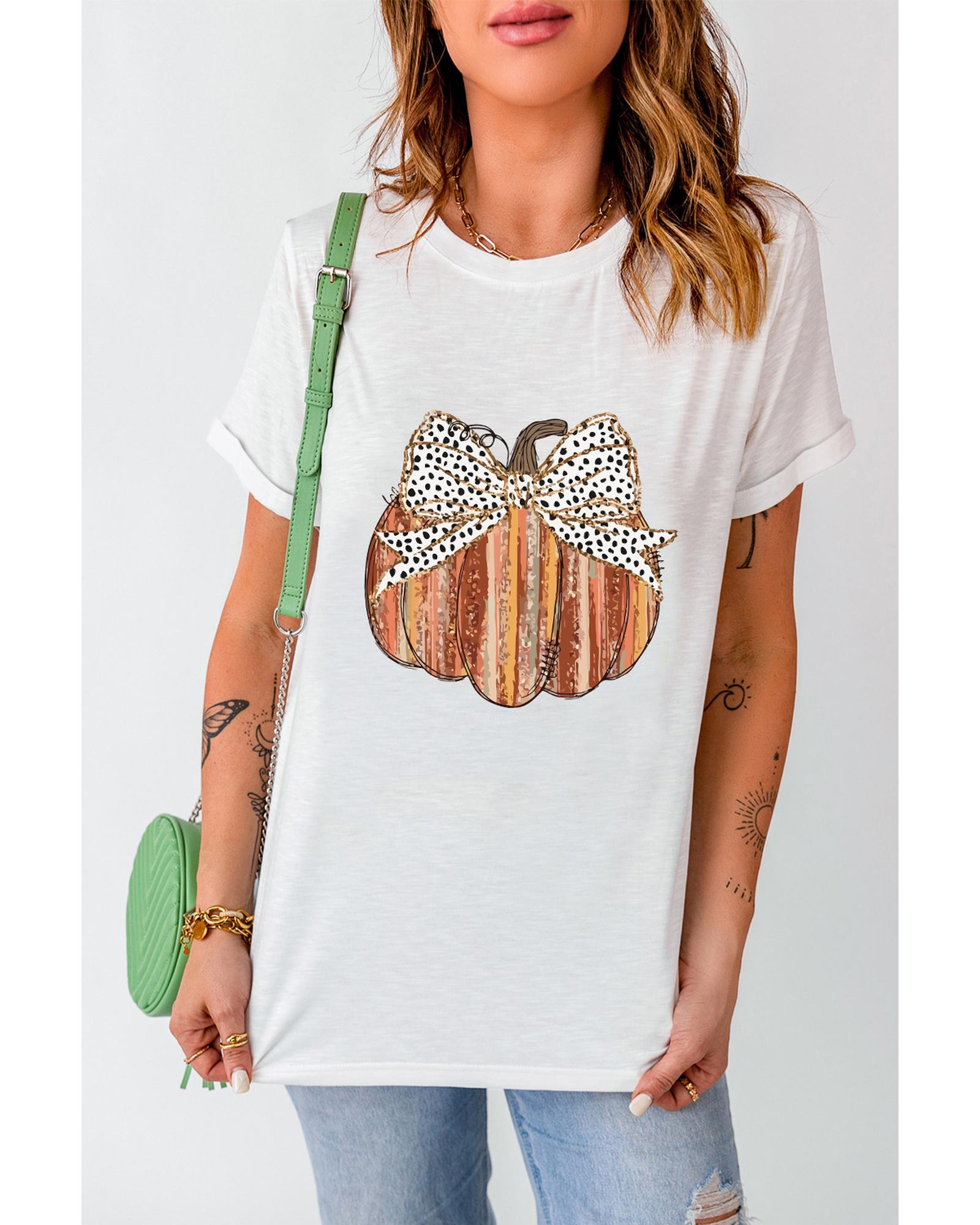 White Thanksgiving Bow Knot Pumpkin Print Round Neck T Shirt – XL