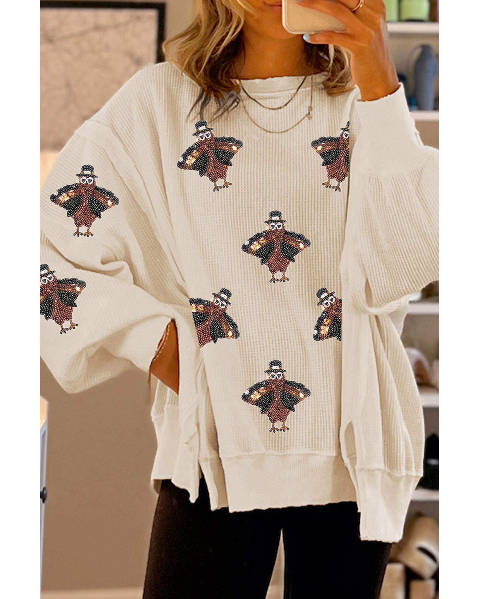White Thanksgiving Turkey Waffle Oversized Knit Top Sequin graphic shimmers in the light Oversized design for a comfortable fit Dropped puff sleeves for added style Slit details on the sleeves Long - sleeve pullover