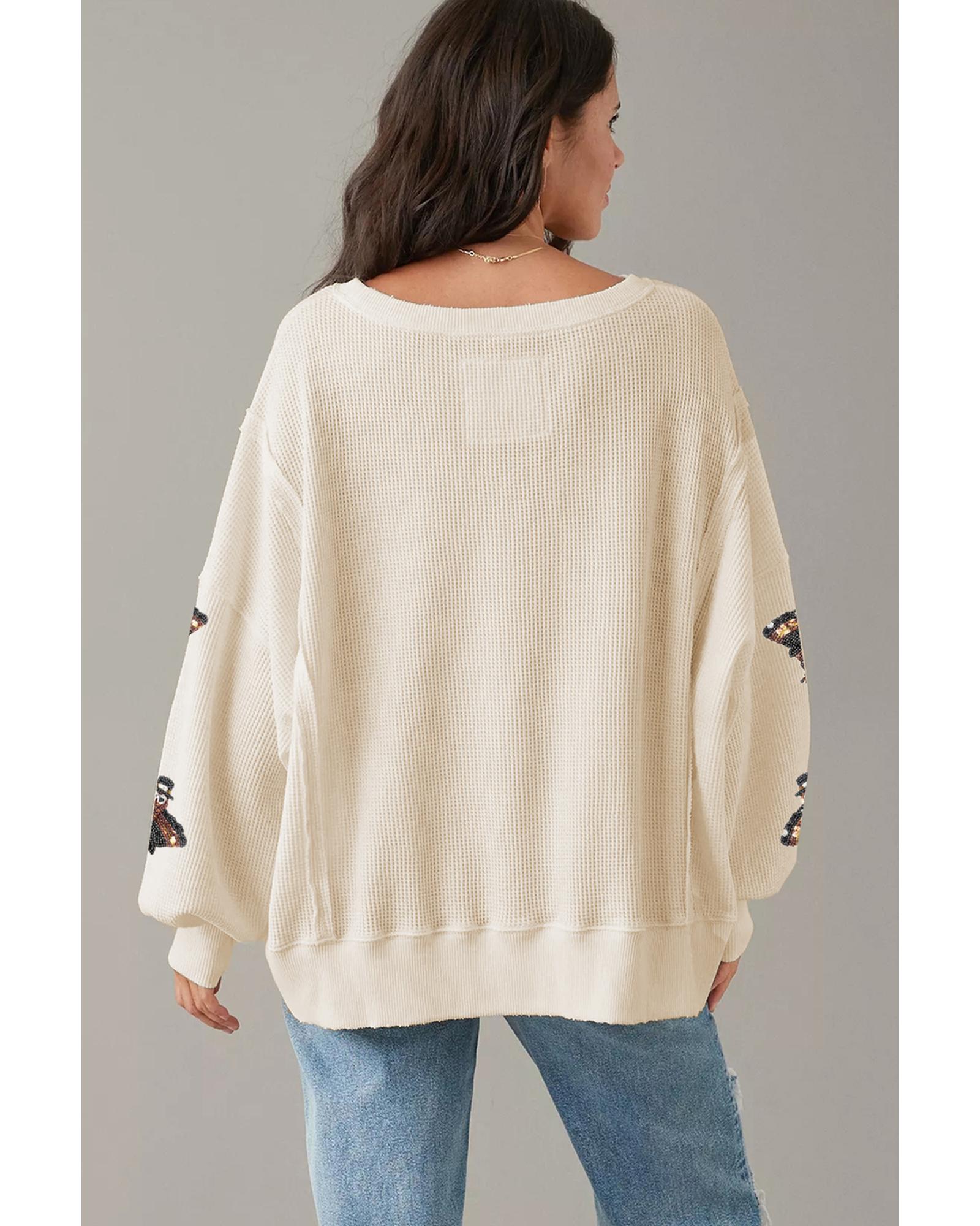 White Thanksgiving Turkey Waffle Oversized Knit Top Sequin graphic shimmers in the light Oversized design for a comfortable fit Dropped puff sleeves for added style Slit details on the sleeves Long - sleeve pullover