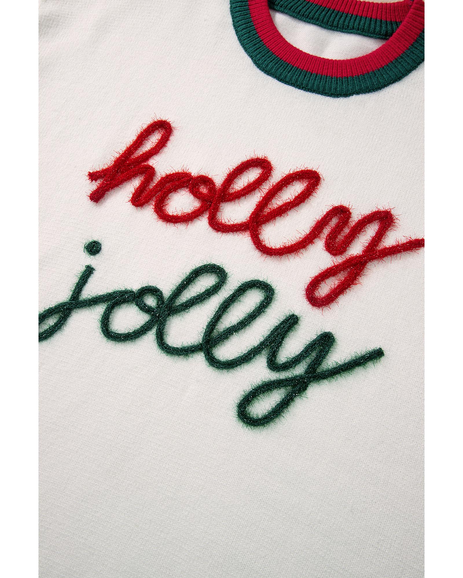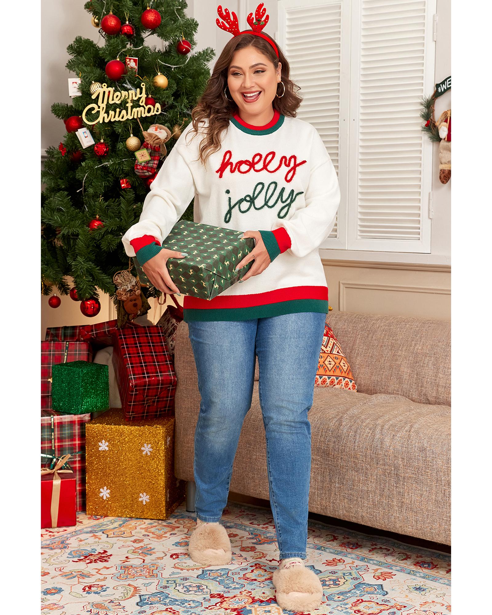 - White Tinsel Holly Jolly Pattern Colorblock Edge Drop Shoulder Plus Size Sweater