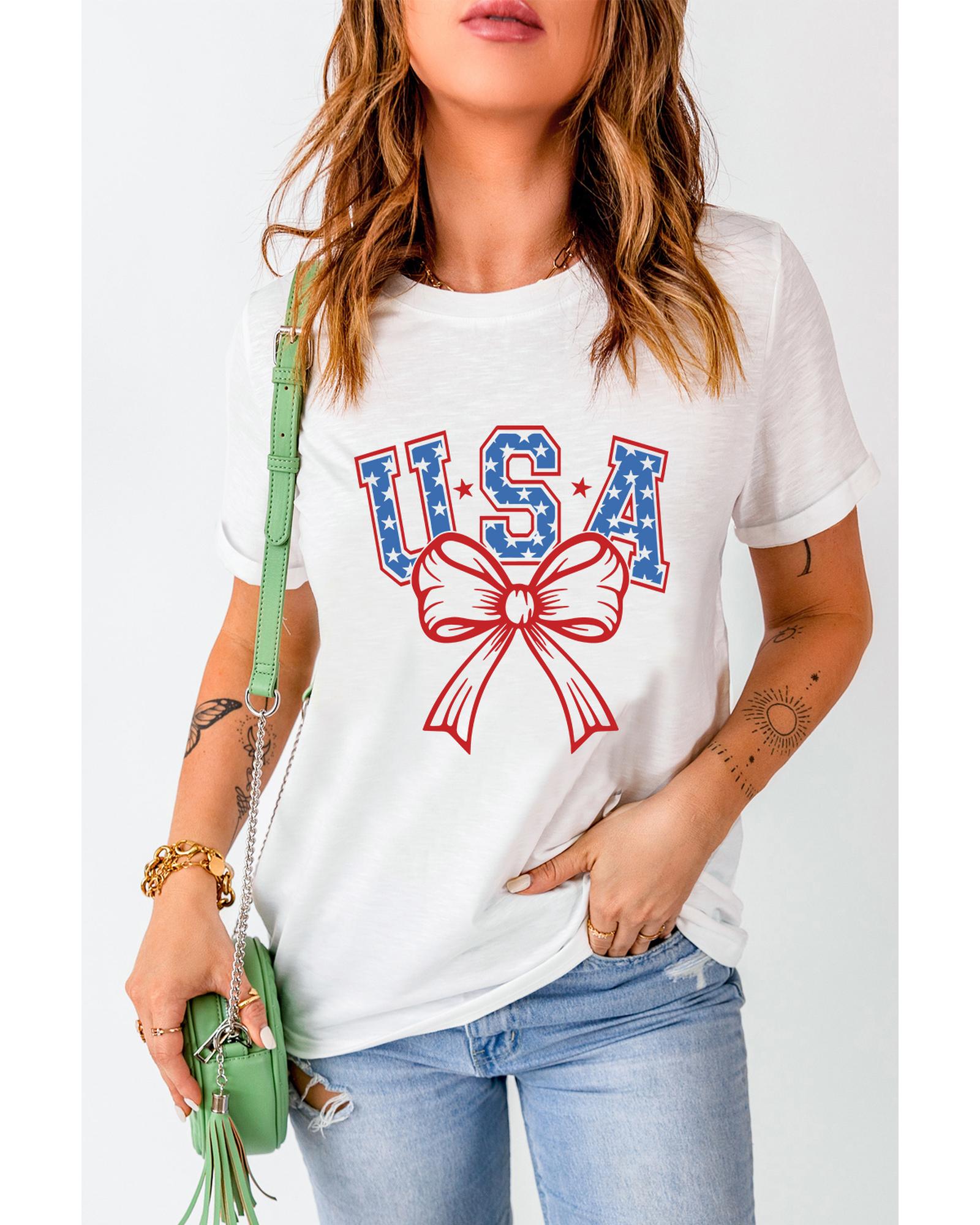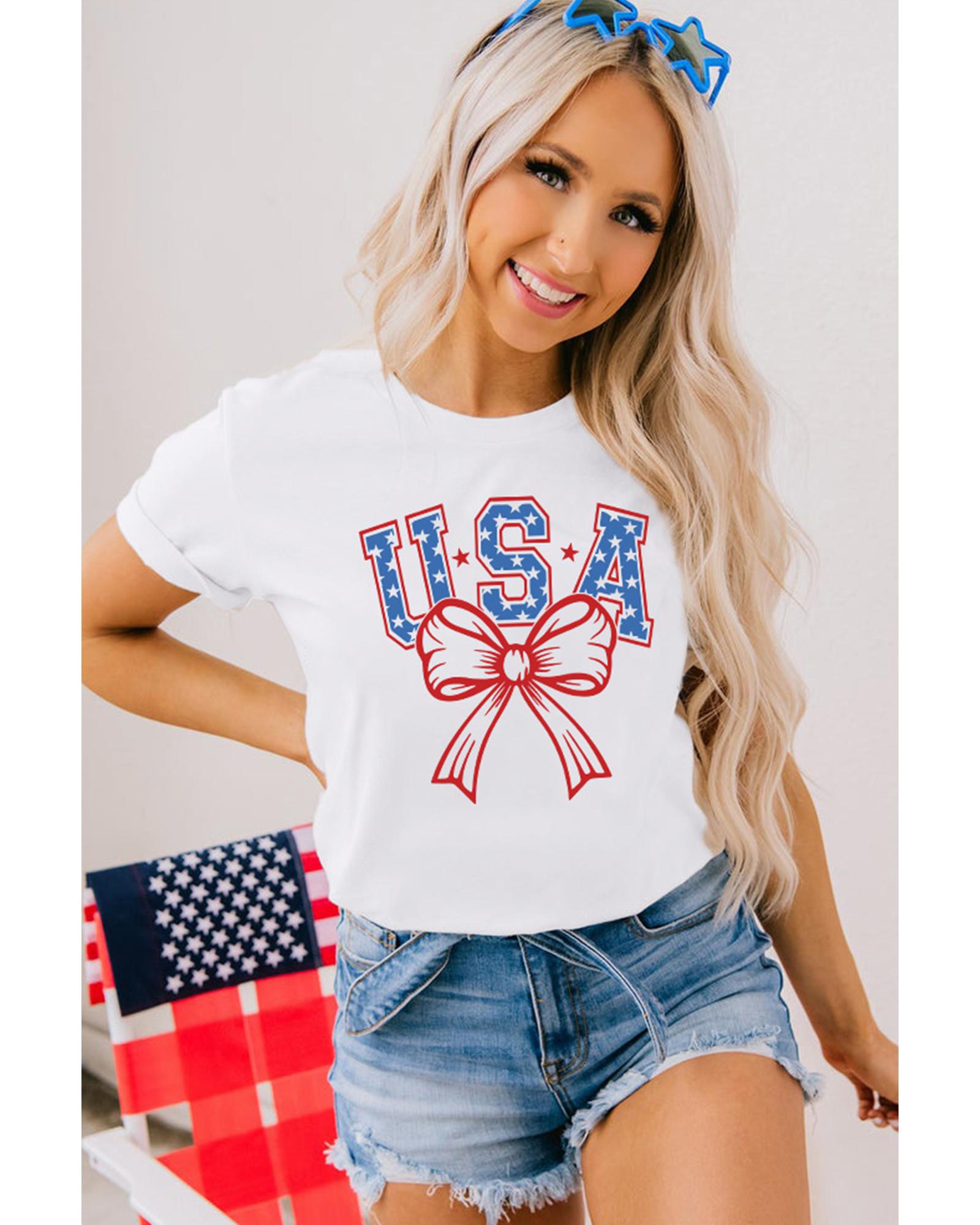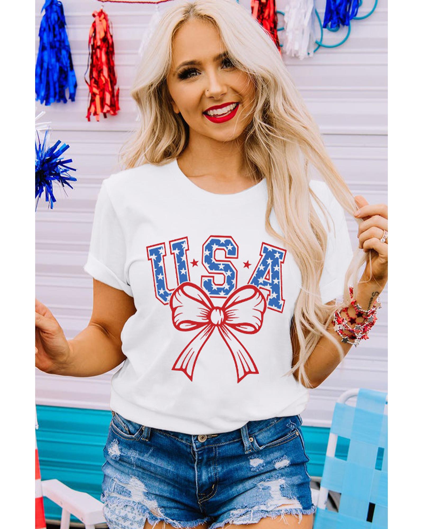 White USA Bow Letter Graphic Short Sleeve Top – 3XL