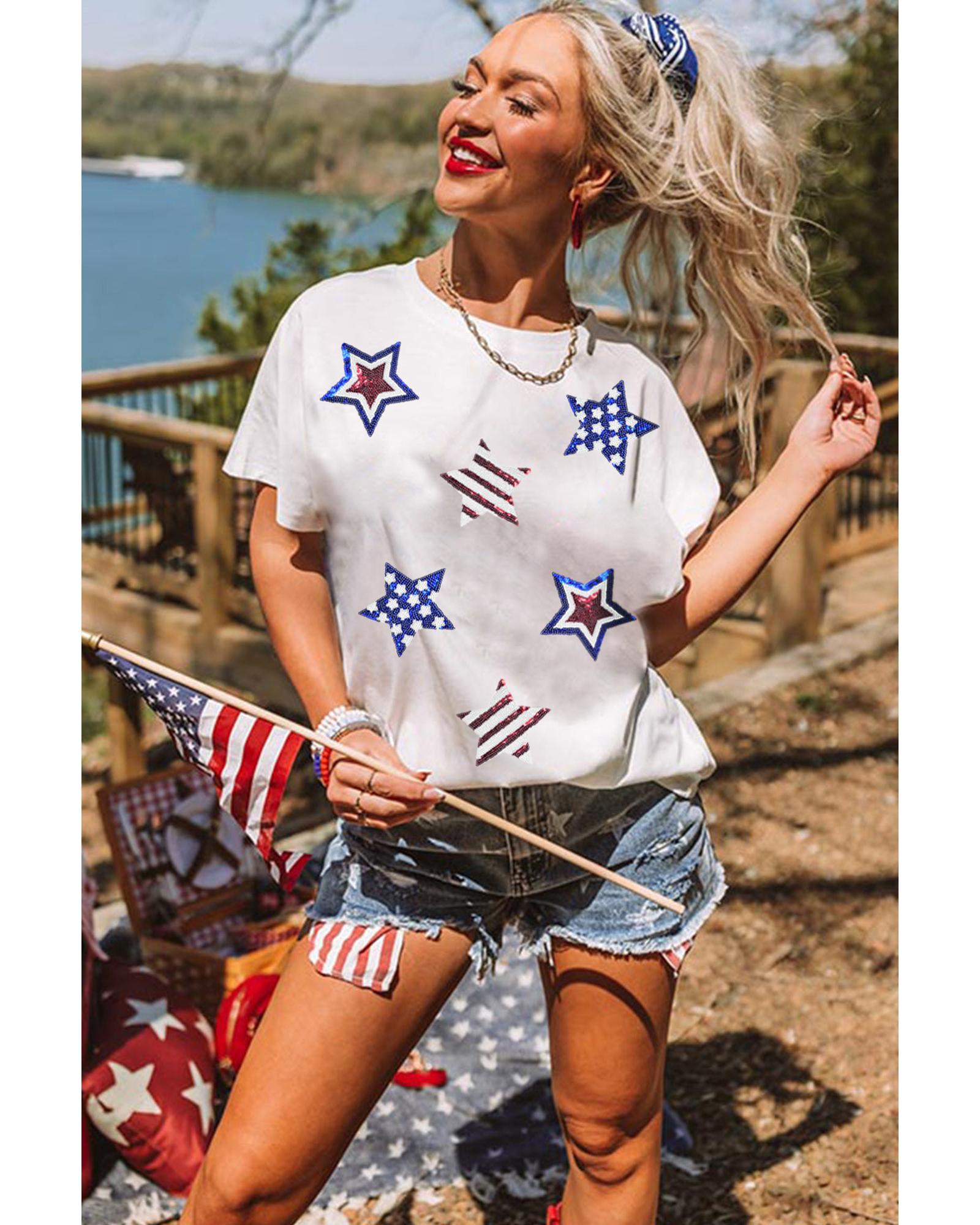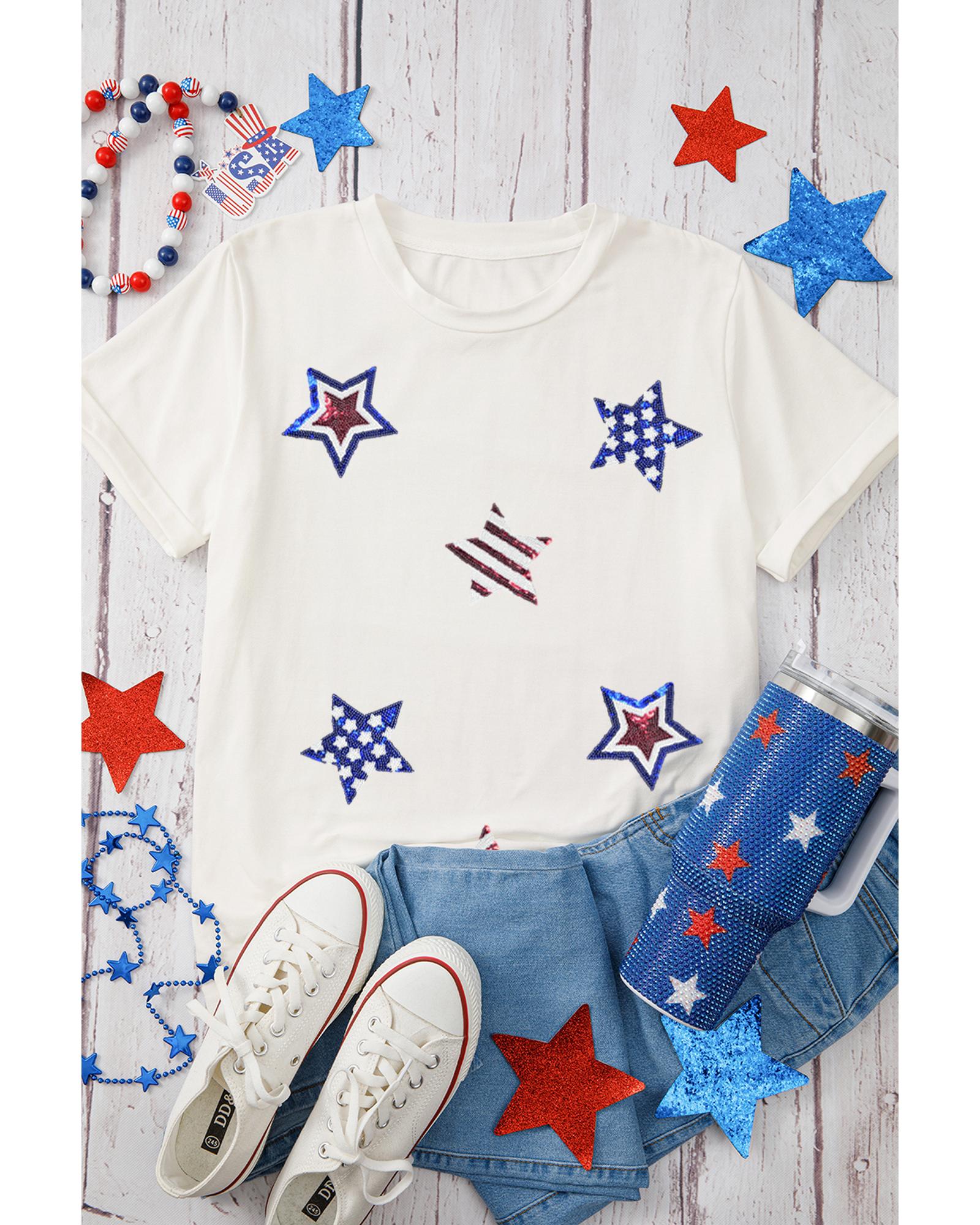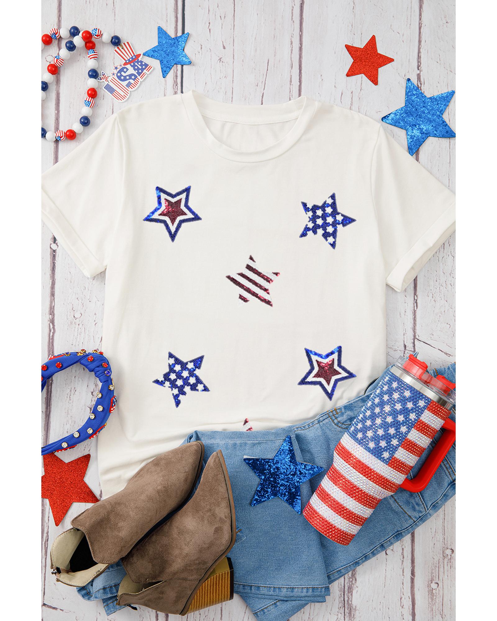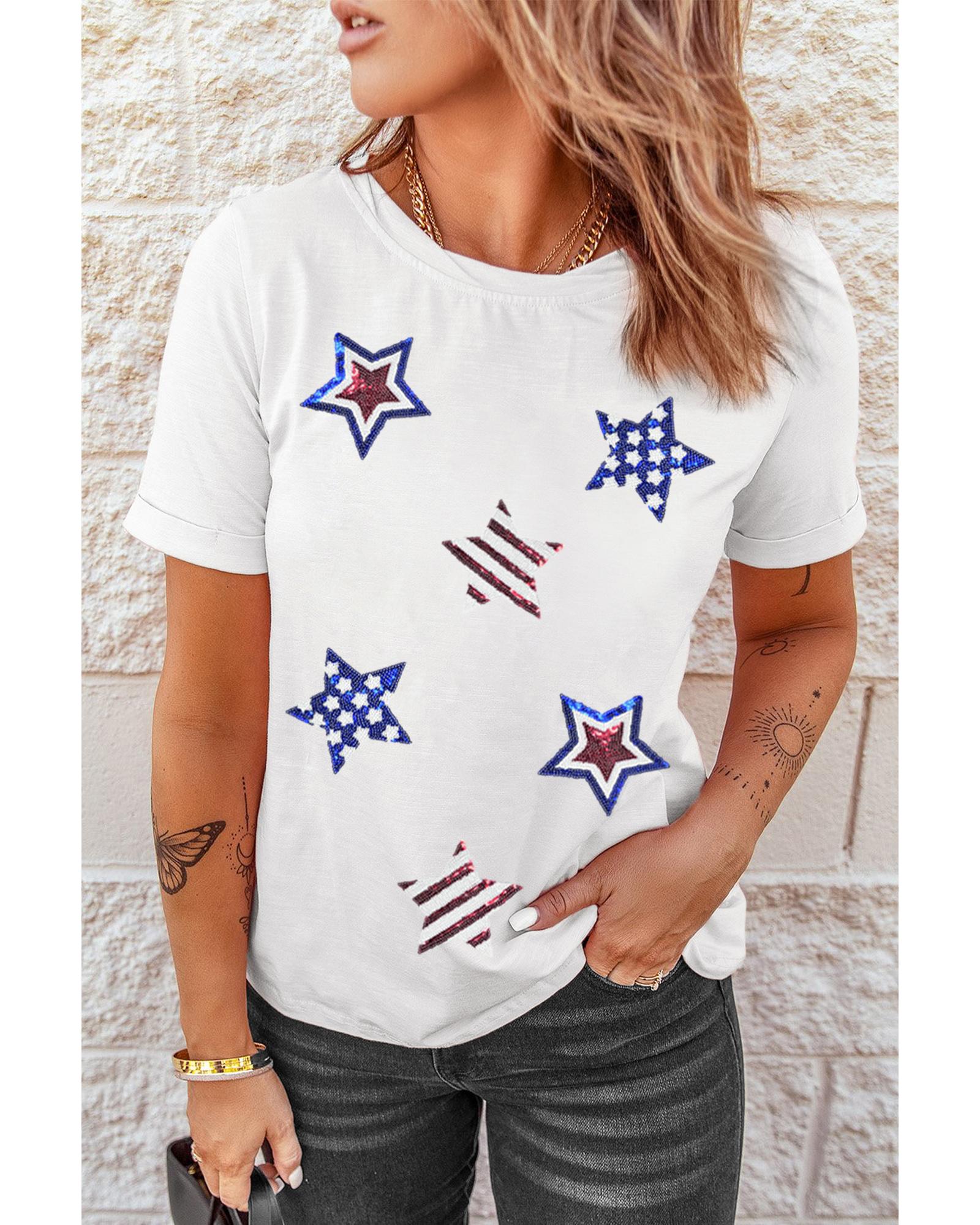 - White USA Sequin Stars Patched Casual T Shirt