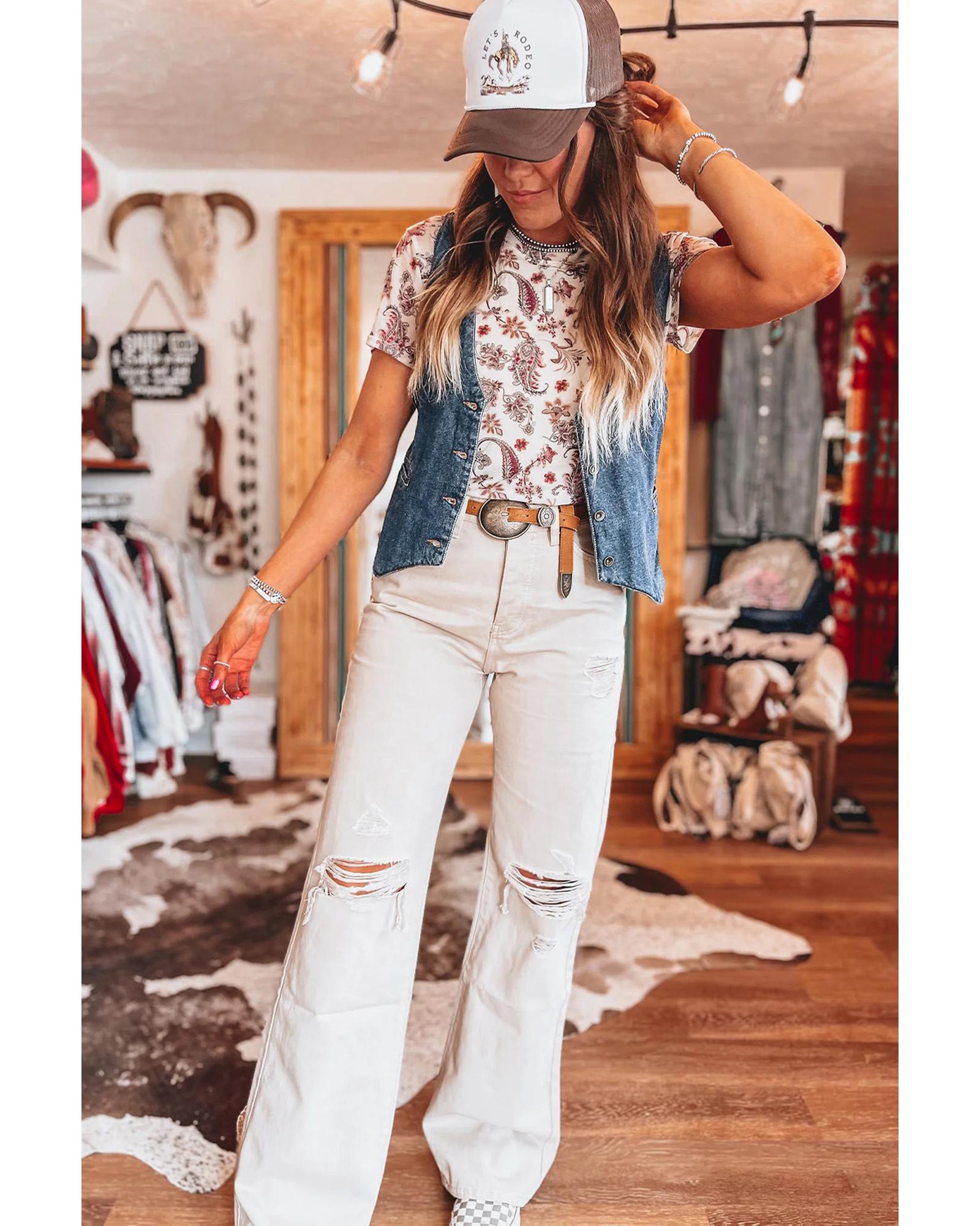 Pink Waffle Floral Patchwork Exposed Seam Detail Short Sleeve Top - L