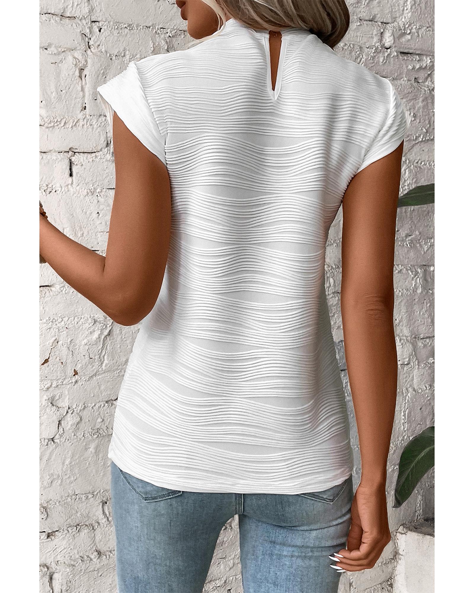 White Wavy Textured Mock Neck Cap Sleeve Top – L