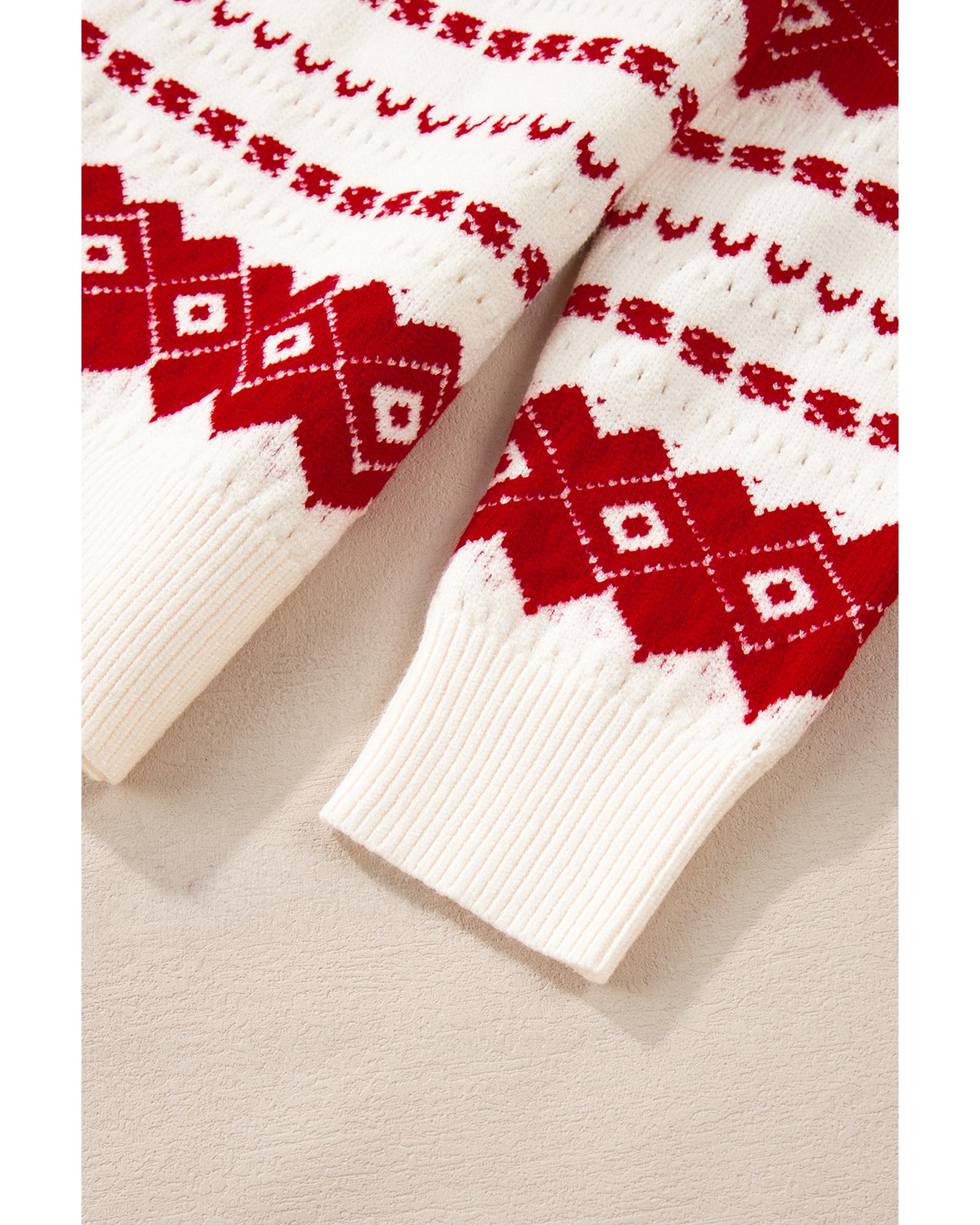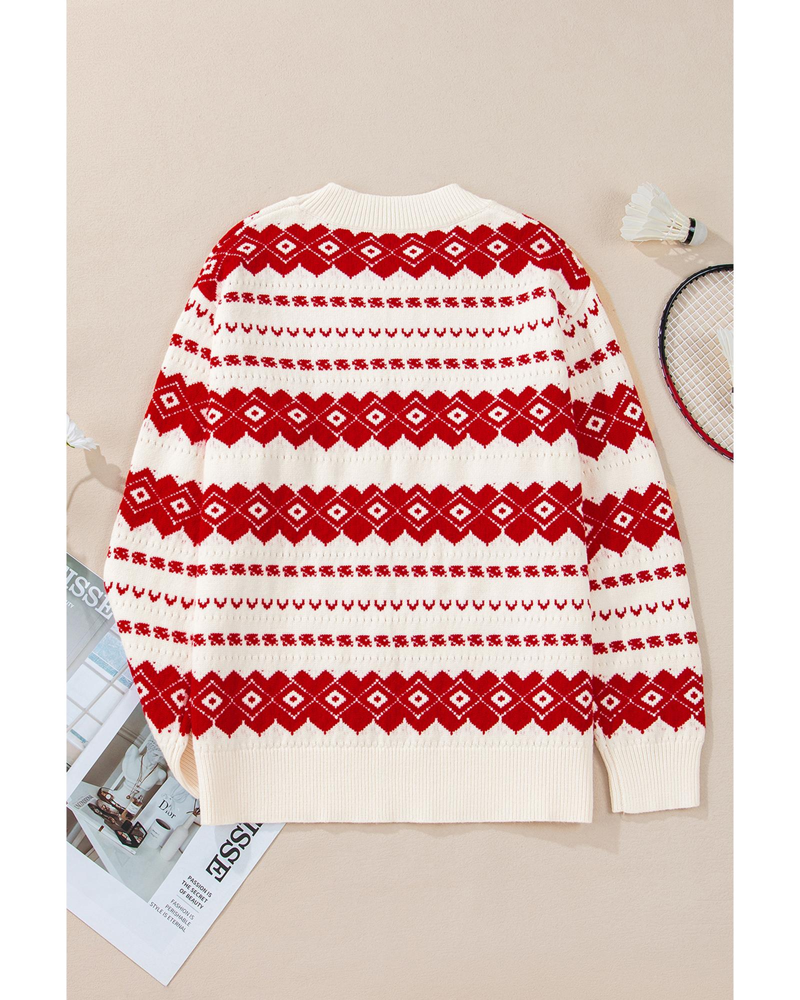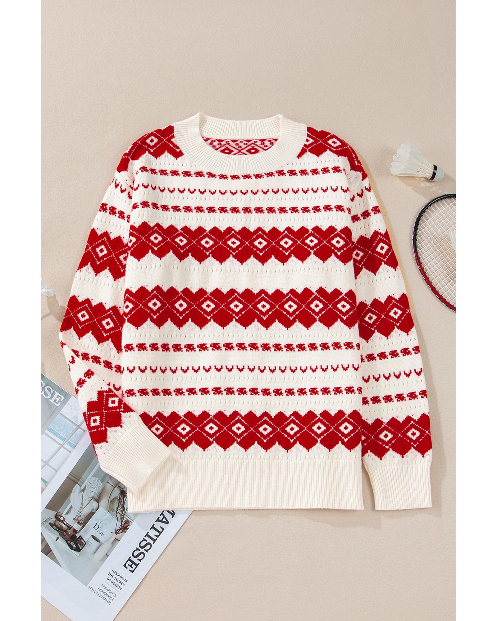 White Western Geometric Patterned Crew Neck Loose Sweater – L
