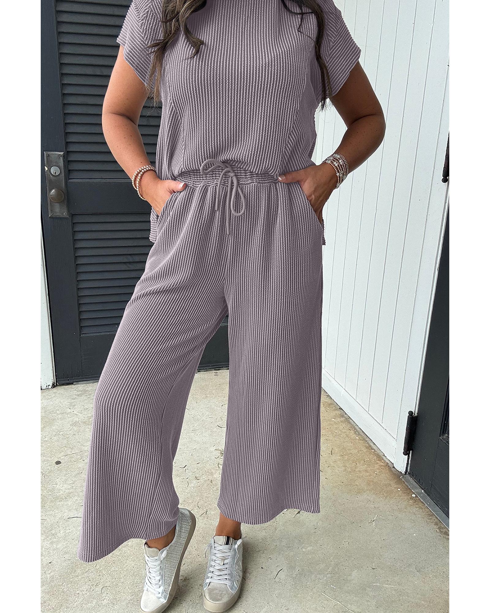 Wild Wind Solid Corded Knit Short Sleeve T Shirt and Wide Leg Pants Set – S