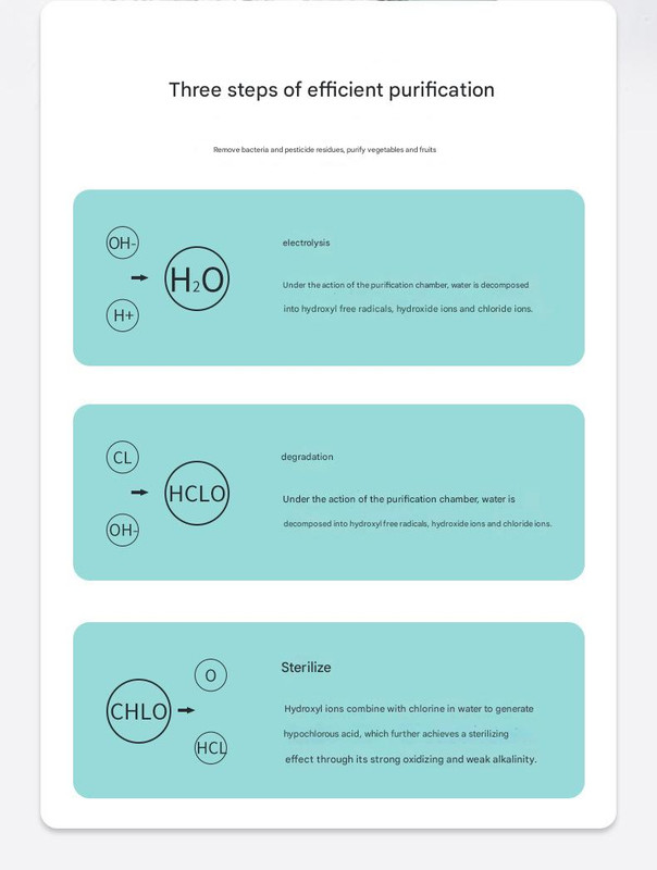 - Three-Step Efficient Purification: Electrolysis (decomposes water into hydroxyl radicals and chlorine ions), Degradation (breaks down residues), and Sterilization (hydroxyl radicals and chlorine combine to form hypochlorous acid for sterilization).