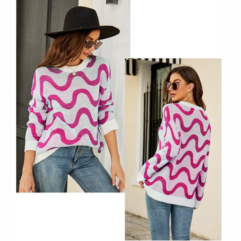 Women Casual Pullover Sweater Round Neck Wave Pattern Collision Colour Knitted Sweater – Size M Black – Black