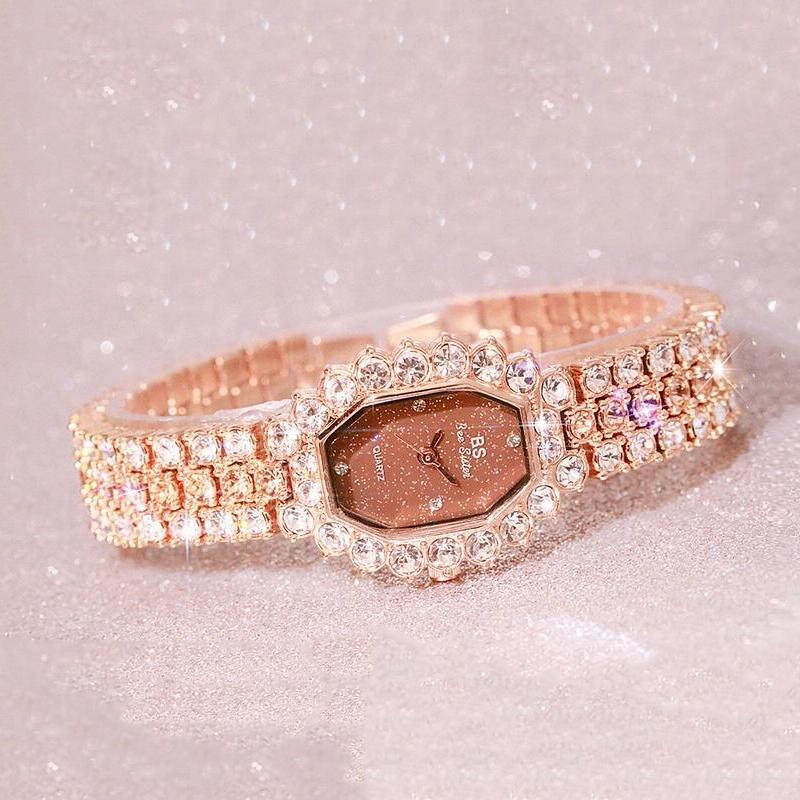 Women Diamond Plated Octagonal Quartz Watch with Rhinestone Bracelet – Rose Gold Coffee Diamond