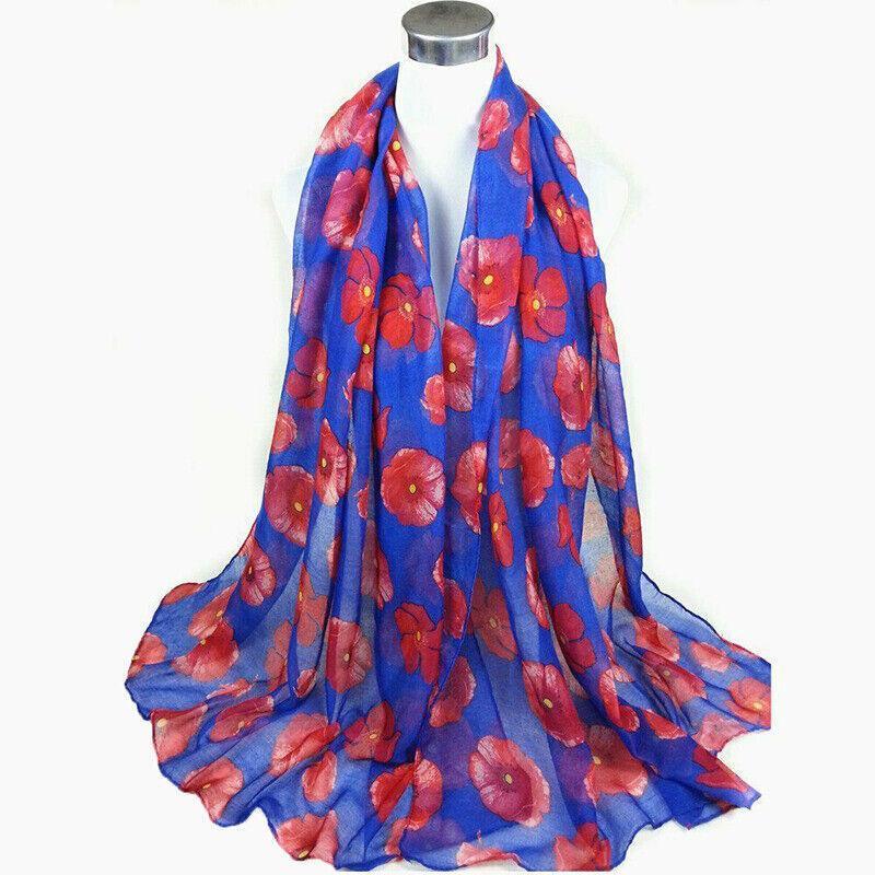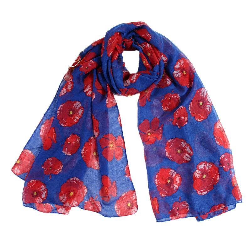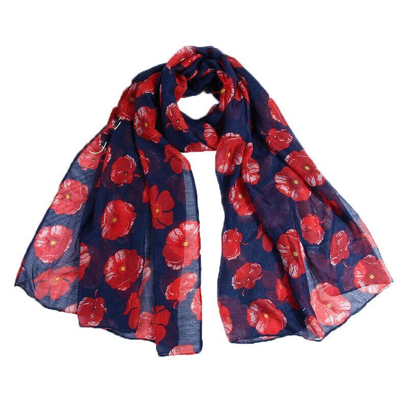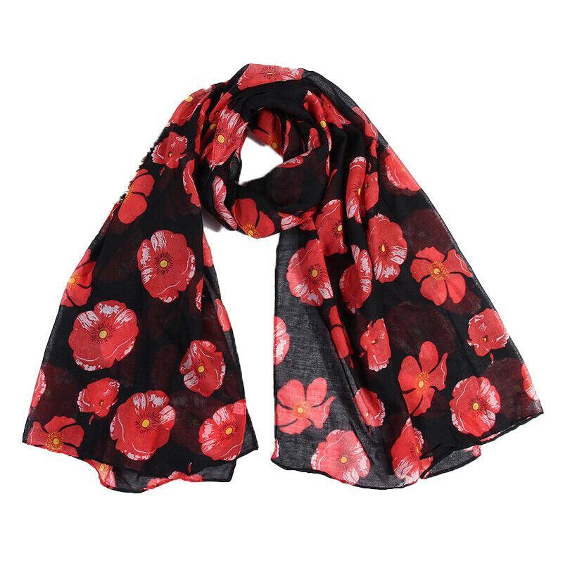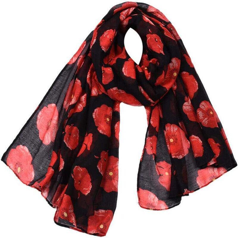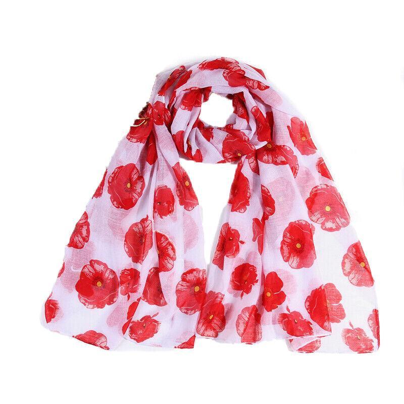Women Ladies Poppy Print Floral Scarf Remembrance Day Poppies Scarves Wrap Shawl – White