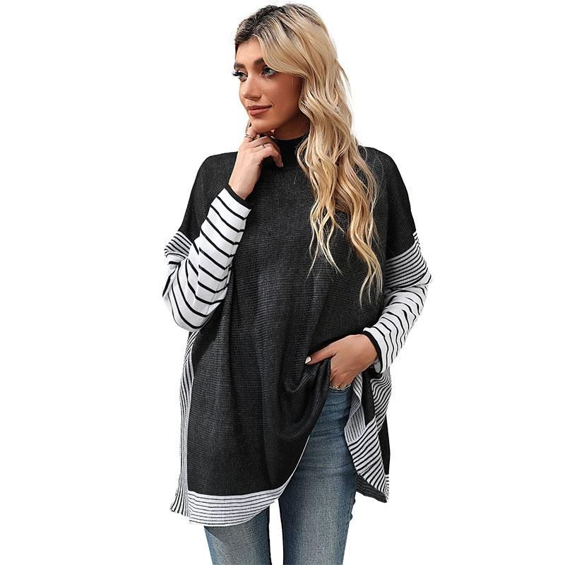 Women Long Sleeve Mock Neck Striped Knit Sweater Casual Tops Black – L