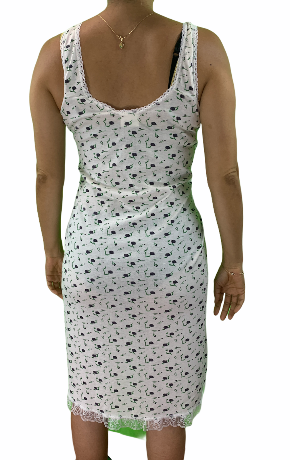 – Lovely Soft Cotton material – Sleeveless, breathable “airy” style – Lovely lace detail on neckline, arm opening and bottom hem