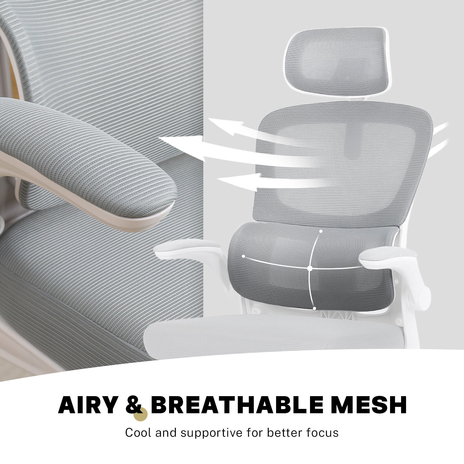 The office chair is designed to do just that. It quietly boosts your comfort while blending into your workspace. The breathable backrest keeps things cool, the built-in lumbar support has your back, literally. An adjustable headrest adds support when you lean in or sit back, while the flip-up arms give you more room when needed and let you tuck the chair neatly under your desk once the day is done.