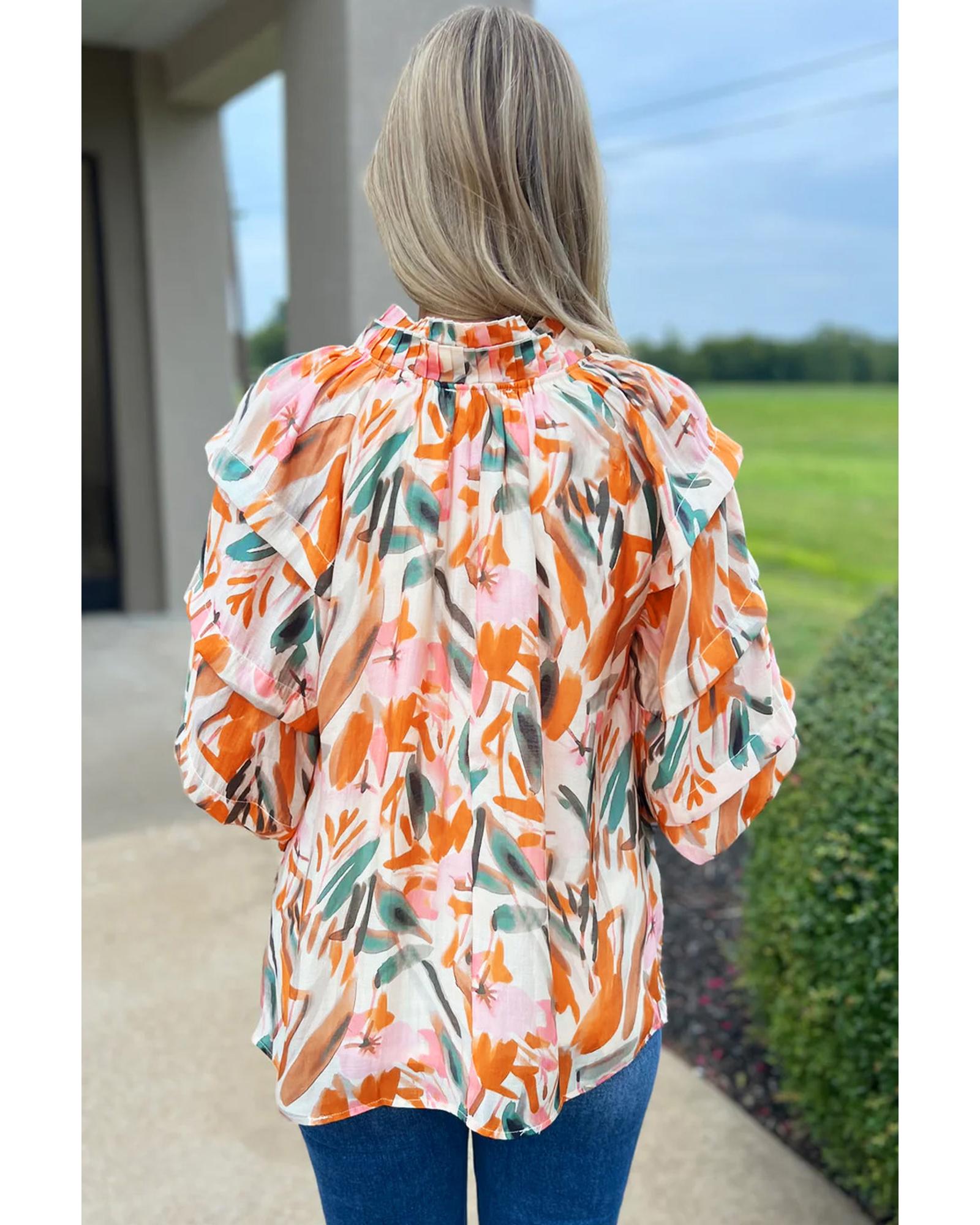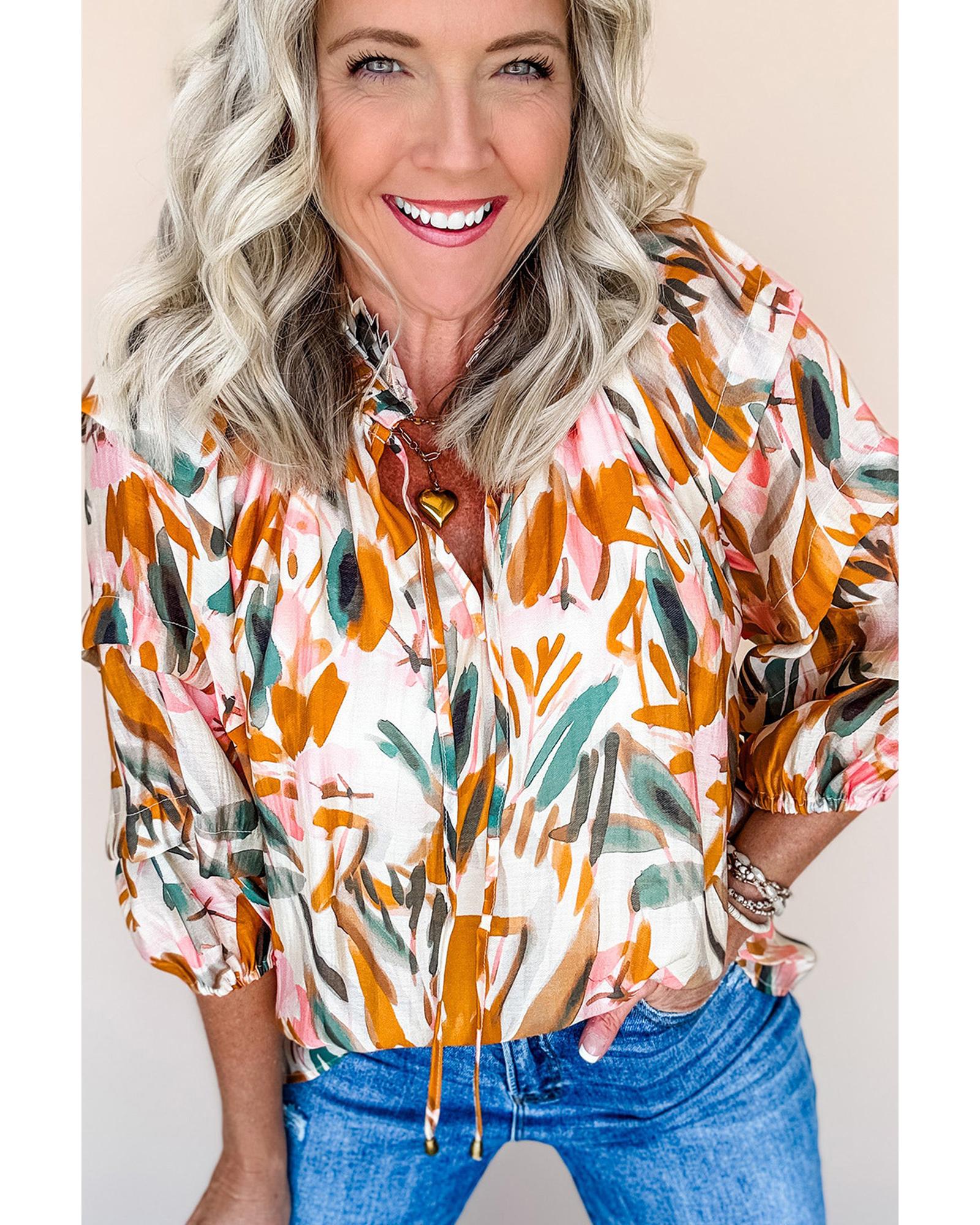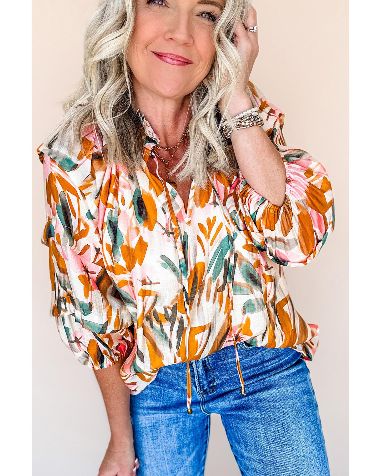 Yellow Abstract Print Drawstring Frilled V Neck 3/4 Sleeve Blouse – XL