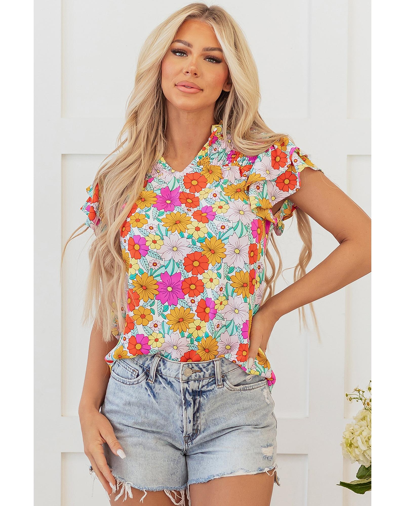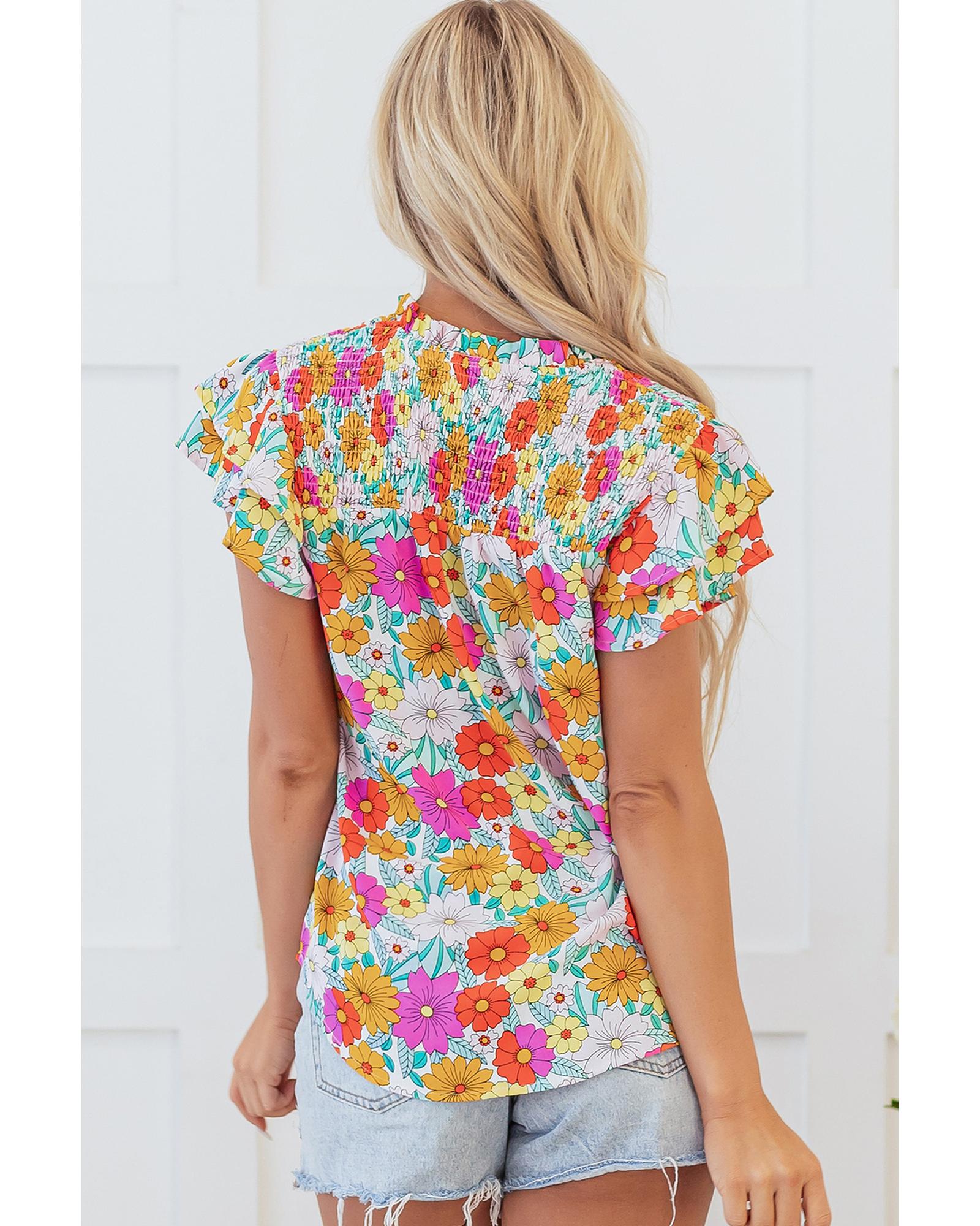 Yellow Floral Print Shirred Tiered Ruffled Sleeve Blouse – M