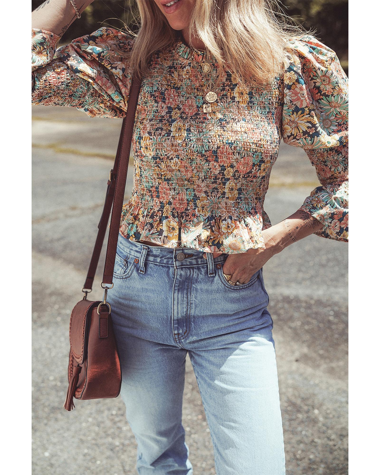 Yellow Floral Print Smocked Bubble Sleeve Ruffled Crop Top – XL