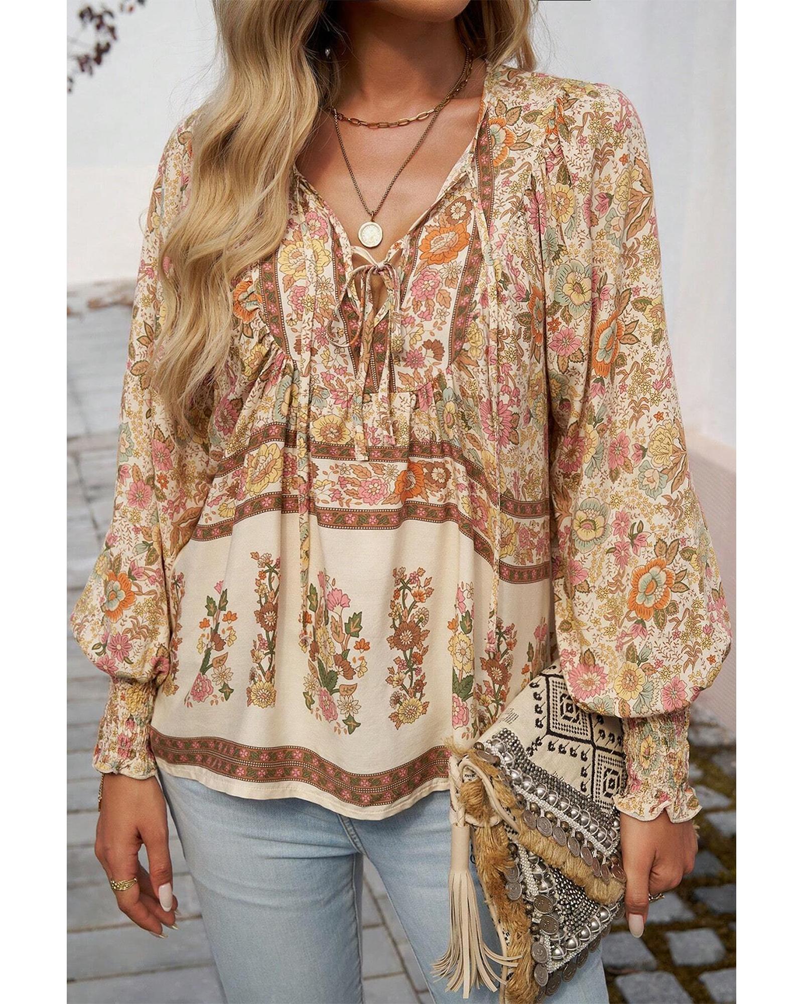 Yellow Floral Print Tie Neck Lantern Sleeve Blouse – XL
