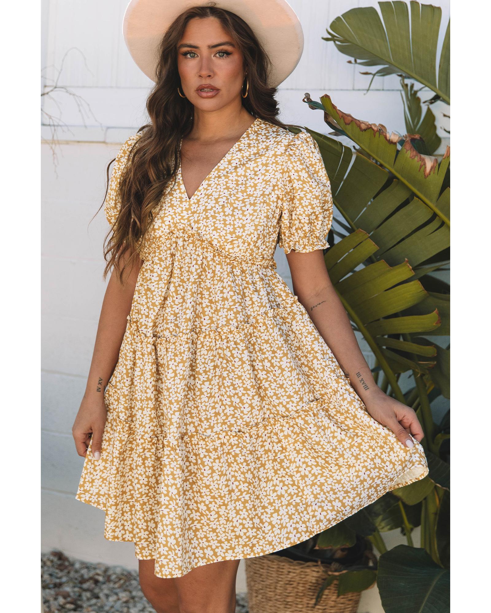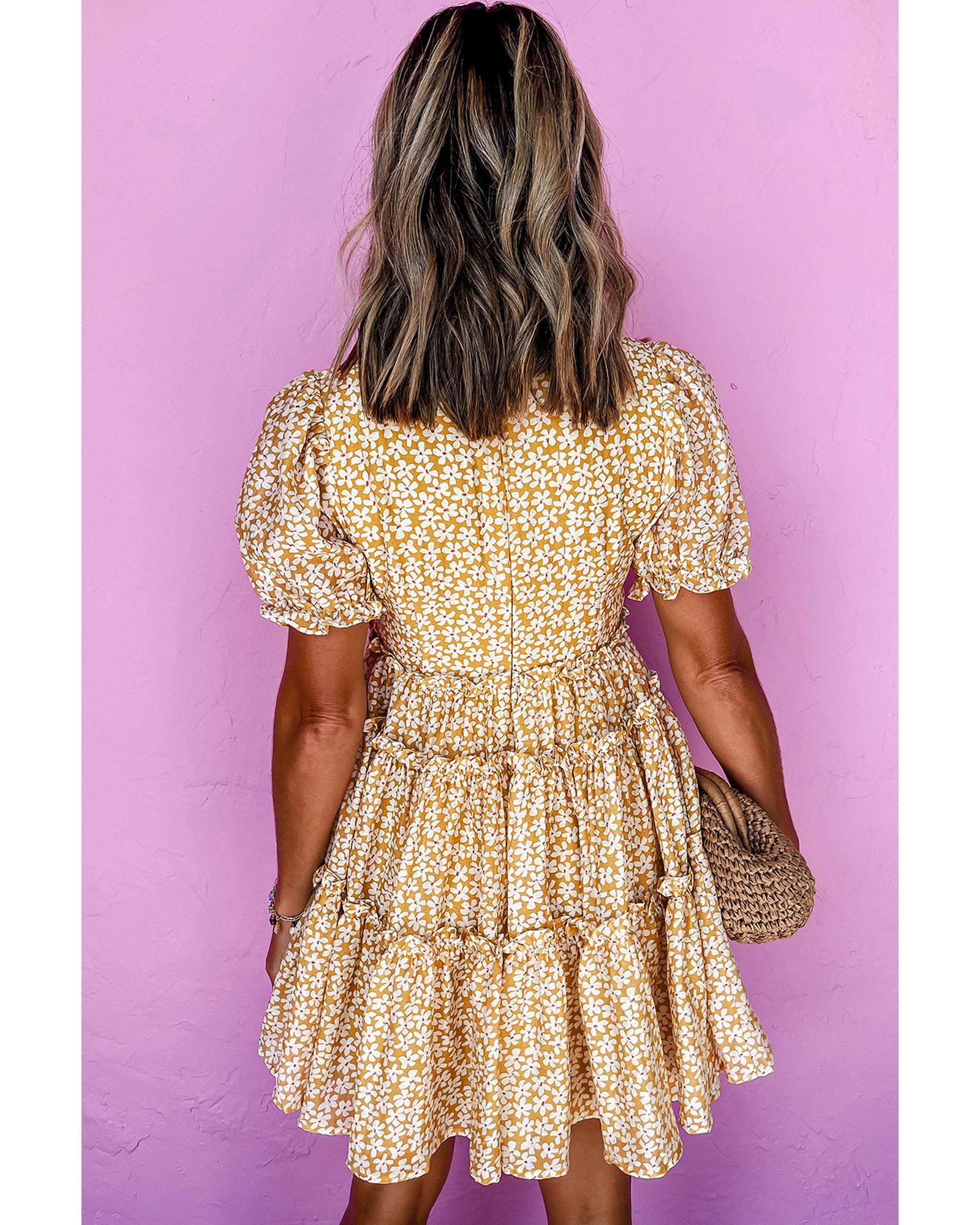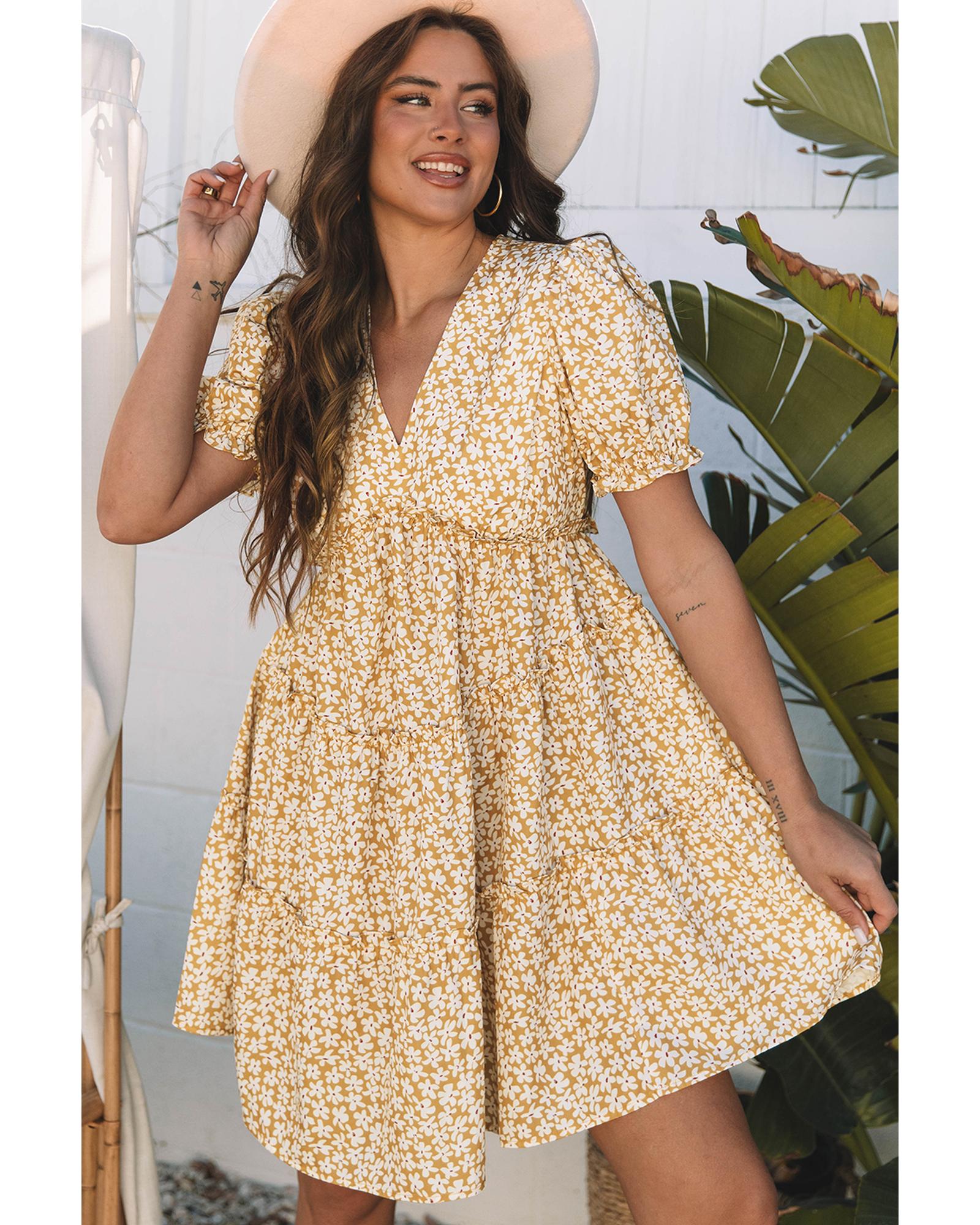 Yellow Floral Short Sleeve V Neck Frilly Tiered Mini Dress – L