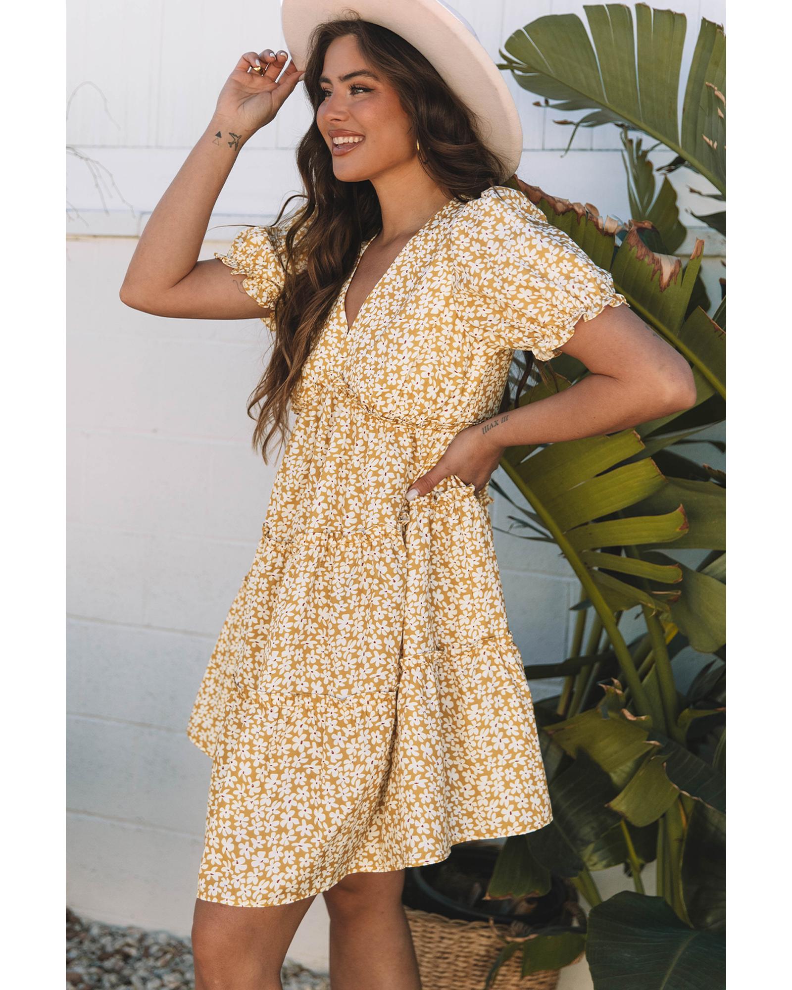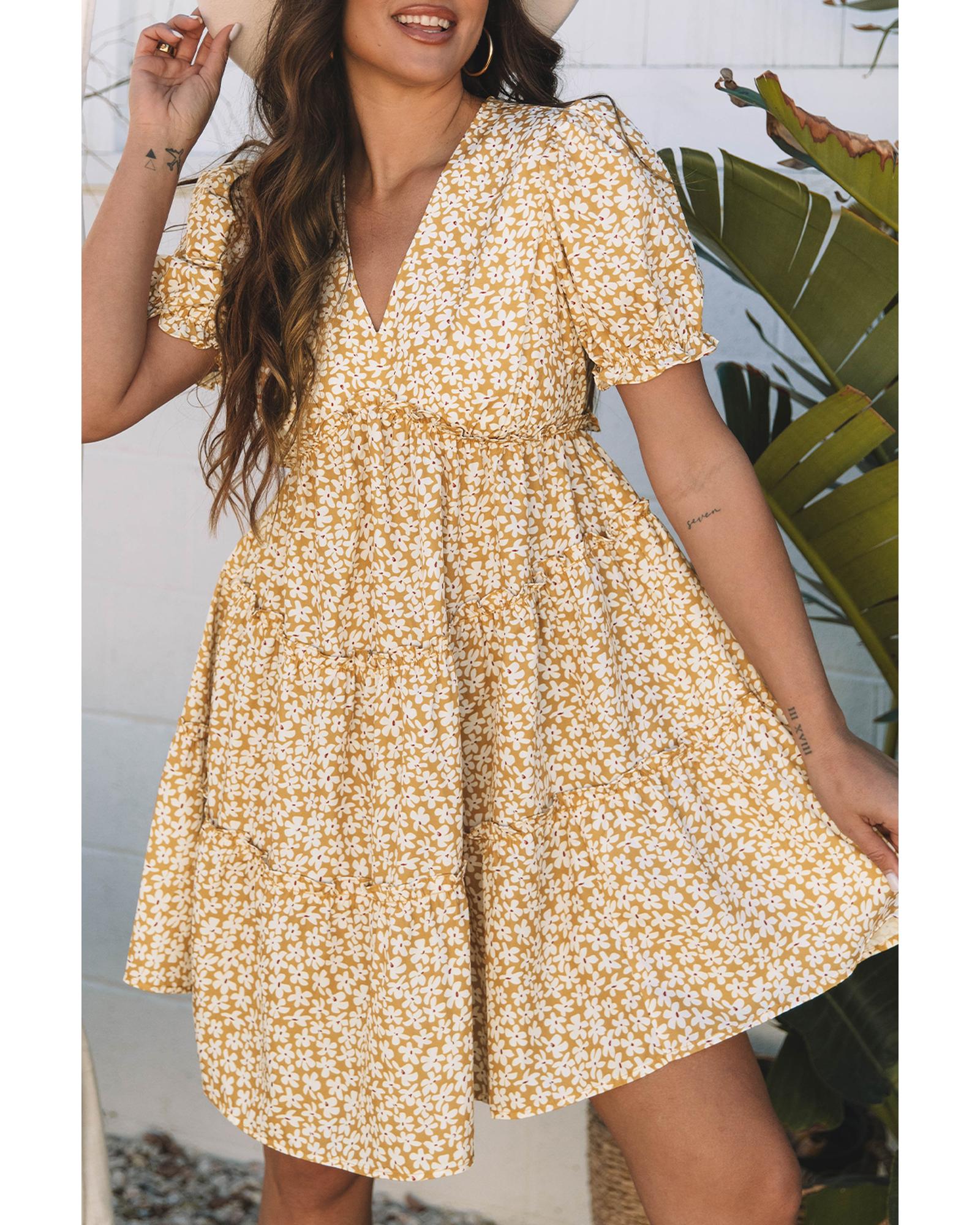 Yellow Floral Short Sleeve V Neck Frilly Tiered Mini Dress – M