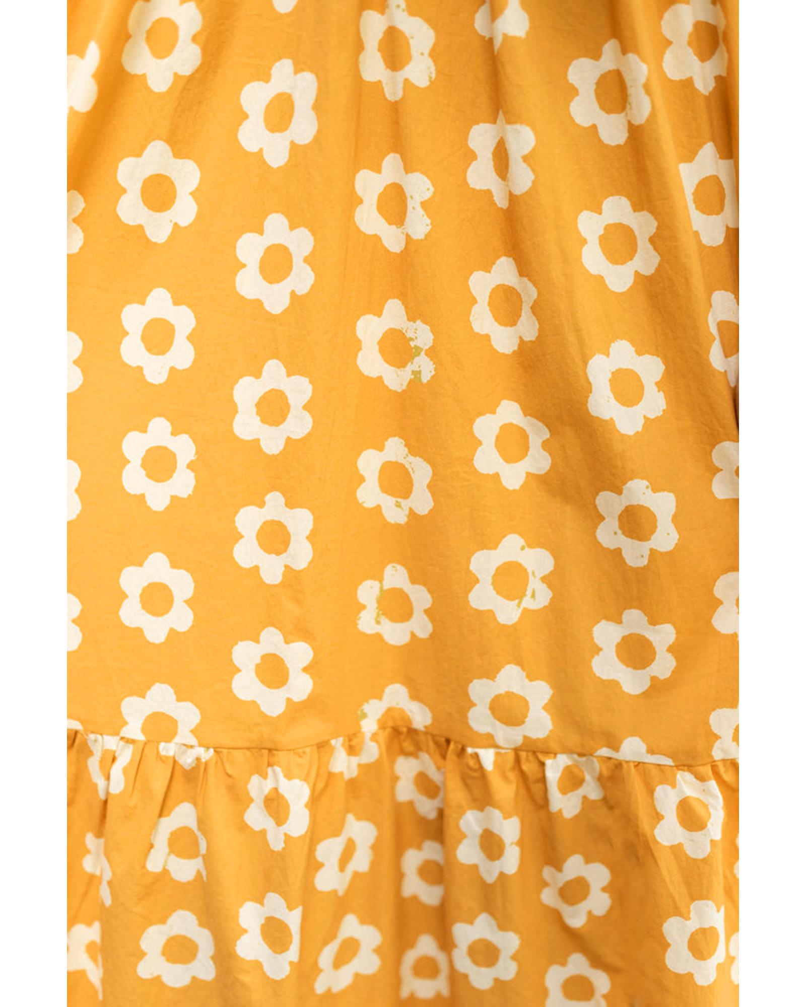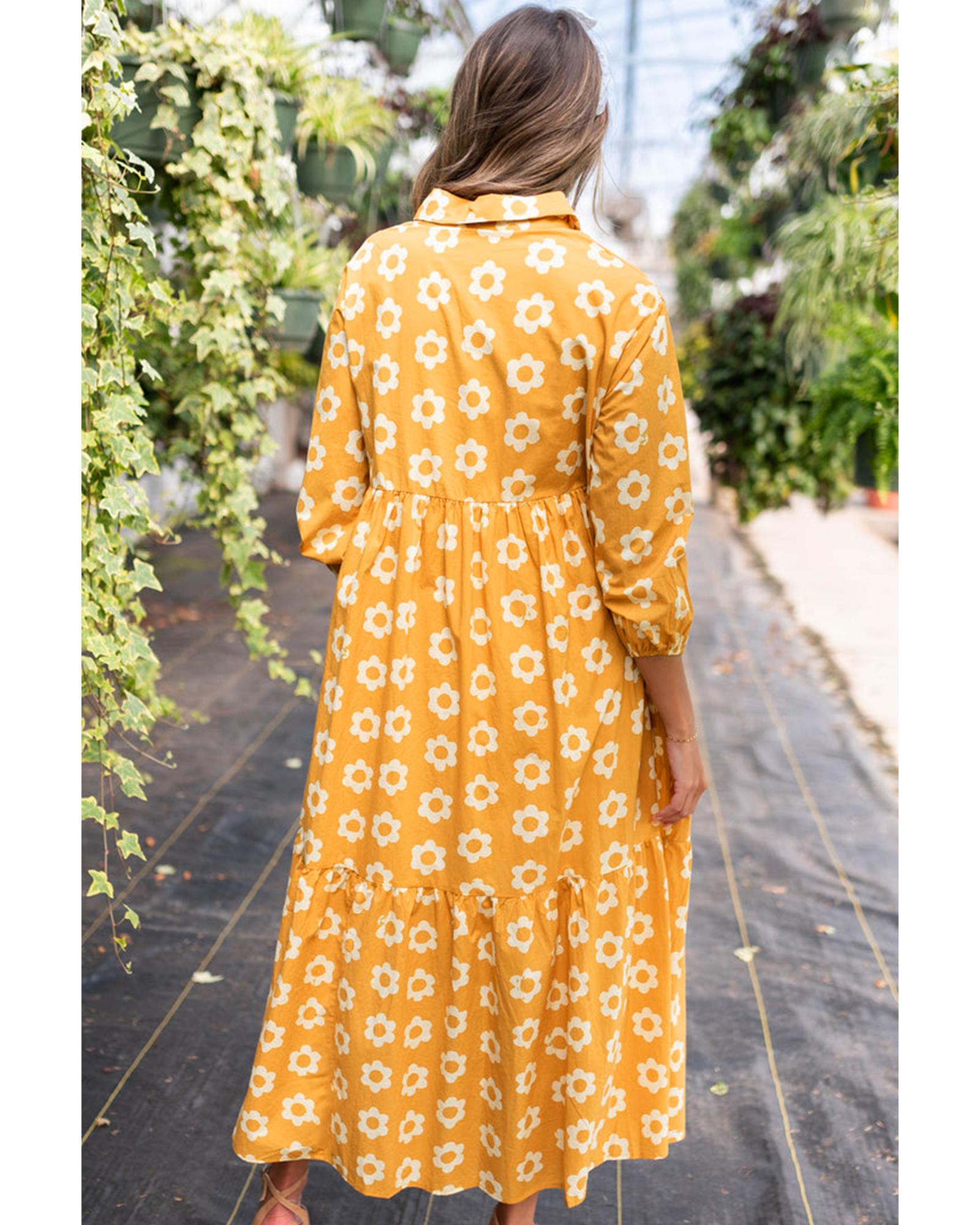 Yellow Flower Print Bracelet Sleeve Buttons Collared Maxi Dress – S