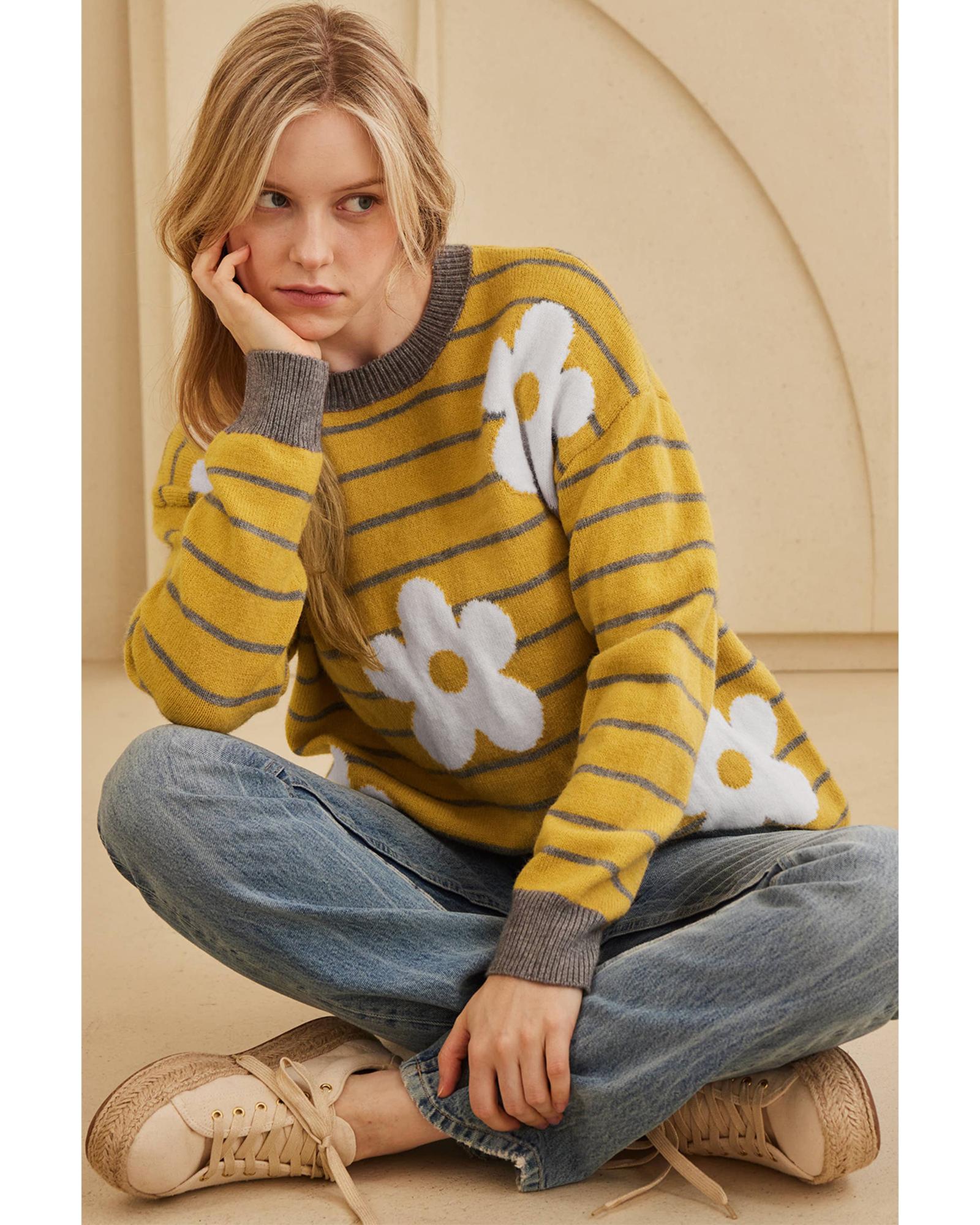 • Yellow Stripe Daisy Floral Knitted Round Neck Sweater
