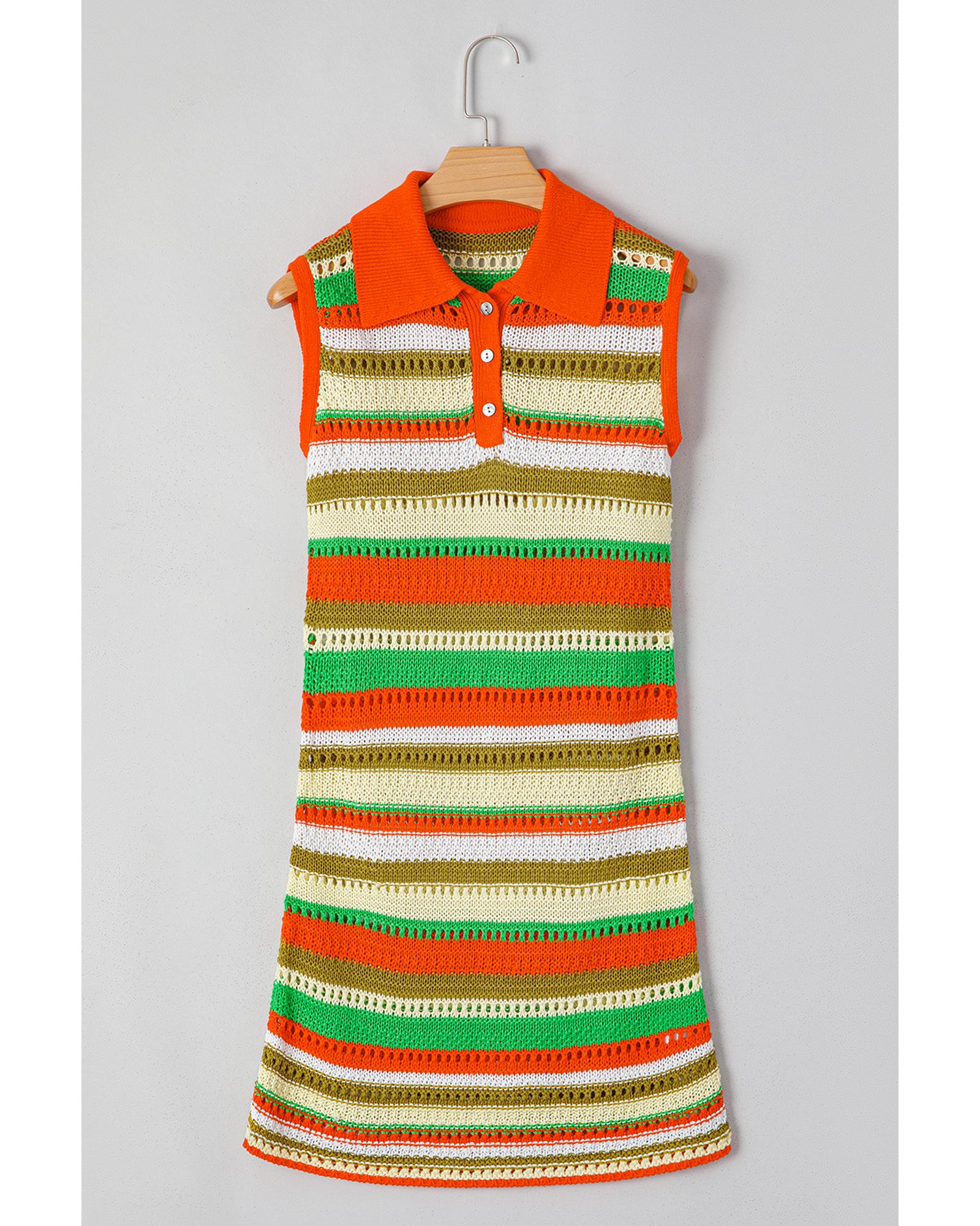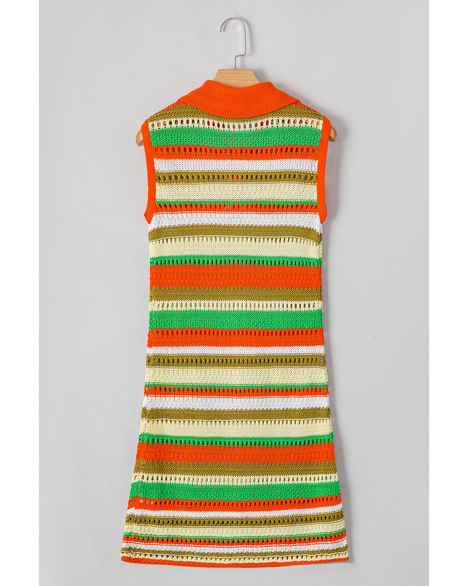 Yellow Stripe Eyelet Sleeveless Buttoned Split Neck Sweater Dress – L