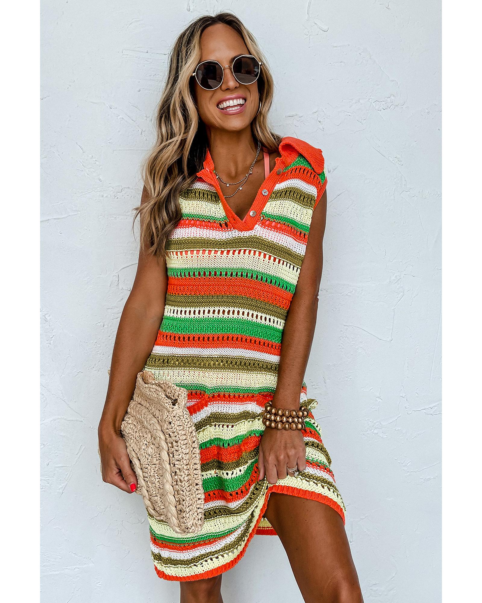 Yellow Stripe Eyelet Sleeveless Buttoned Split Neck Sweater Dress – M