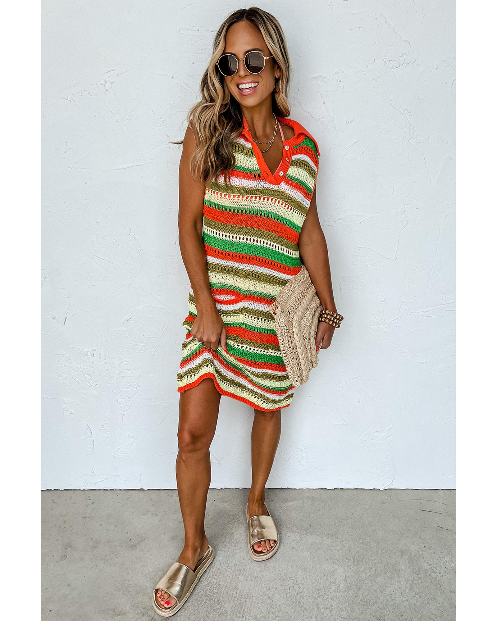 Yellow Stripe Eyelet Sleeveless Buttoned Split Neck Sweater Dress – S