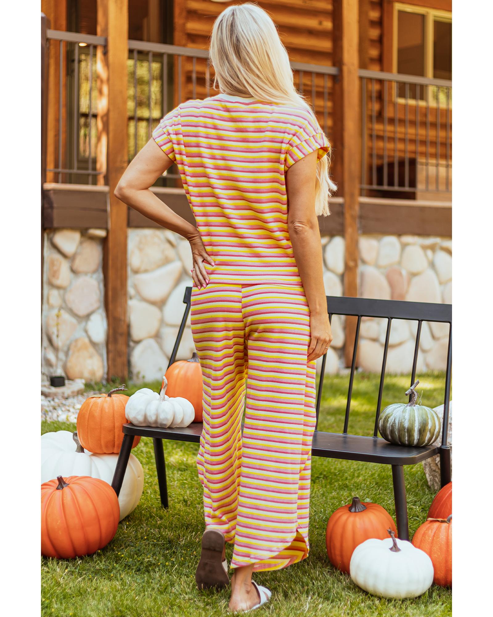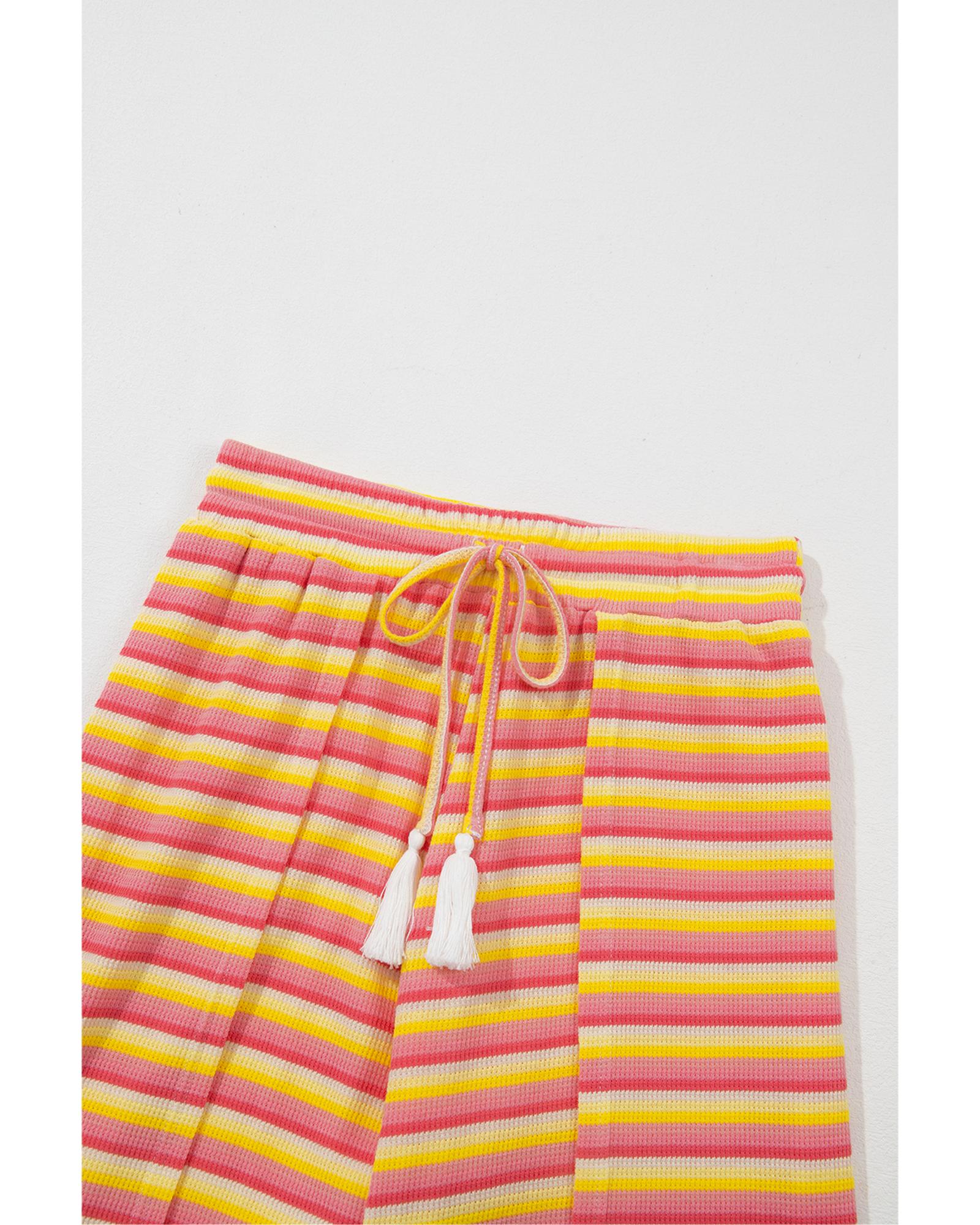 Yellow Stripe Rainbow Tee Tasseled String Wide Leg Pants Set – M