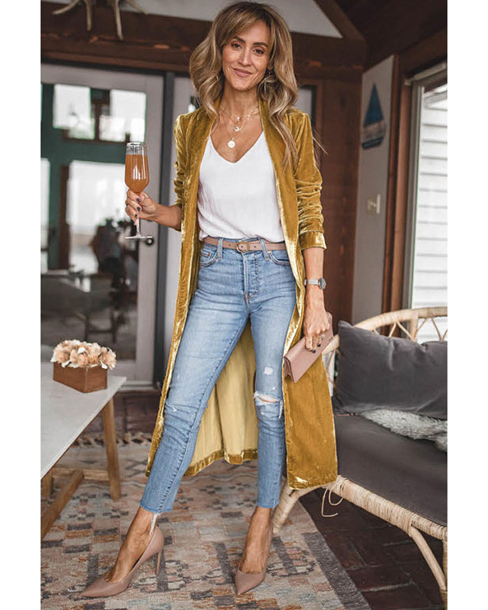 Yellow Velvet Open Front Pocketed Long Duster – 2XL